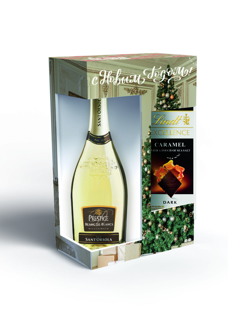 В состав набора входит: Шоколад темный с карамелью и морской солью LINDT 100 г, Вино игристое белое брют Blanc de Blancs SANT'ORSOLA 0,75 л.И здесь снова внимание привлекает игристое вино Sant’Orsola, которым традиционно гордится итальянское виноделие и эта марка в частности. Марка Sant’Orsola создана итальянской компанией Fratelli Martini. Это - старейший бренд производителя. Вина под данным названием выпускаются с 1947 года, когда была основана винодельня. Ассортимент линейки Сант’Орсола - поистине огромен, в нем представлены итальянские вина из разных винных регионов страны, среди которых известные всему миру Prosecco, Asti Spumante, Lambrusco. Эта бутылка умело сочетается со всеми блюдами, особенно с первыми блюдами, пирогом с заварным кремом и омлетами, как говорит сам бренд об этой бутылке. Ну, а шоколад LINDT не нуждается в представлении.