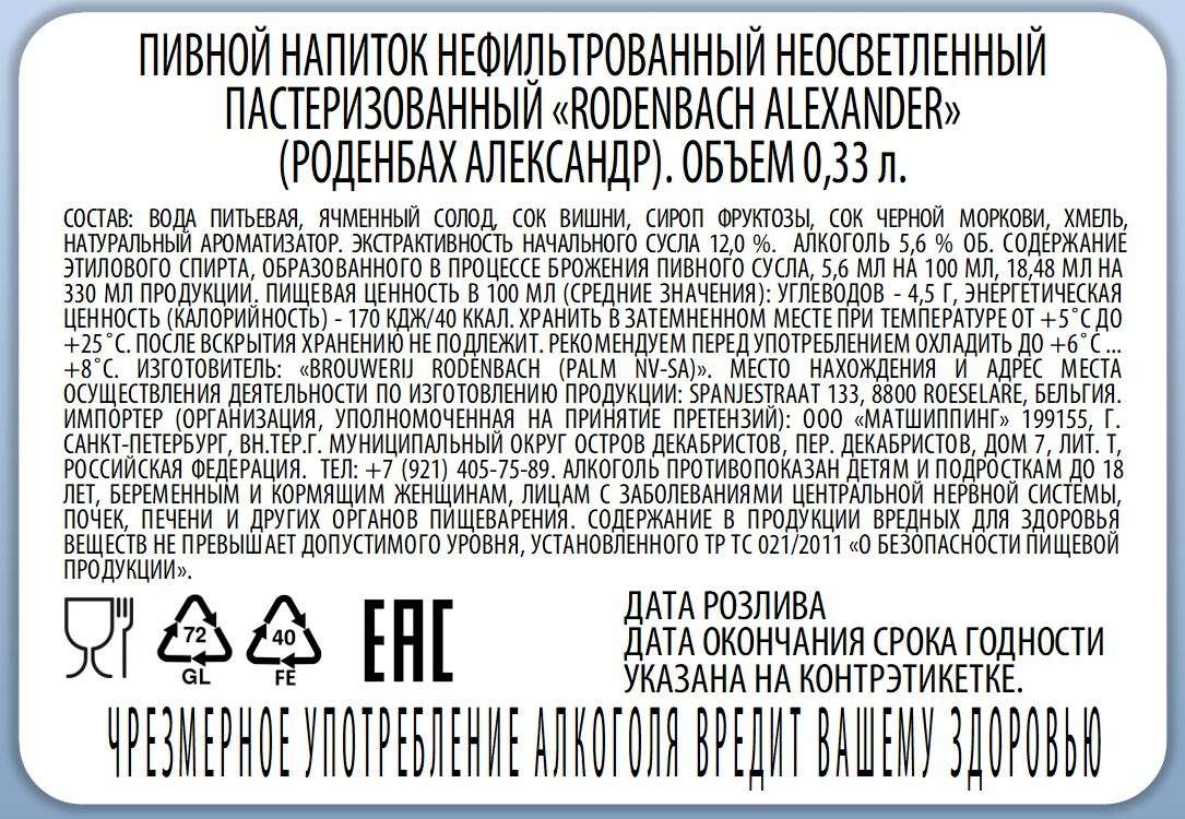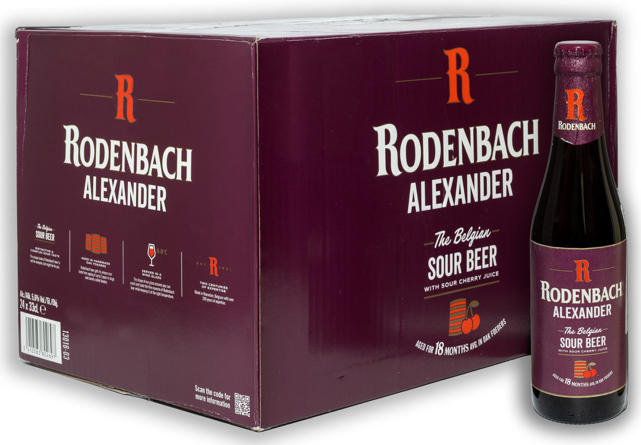 Rodenbach Alexander - фландрский красный эль, впервые сваренный в 1986-м году к 200-летию Александра Роденбаха, соучредителя пивоварни Brouwerij Rodenbach. По многочисленным просьбам любителей пива в Бельгии и за рубежом, почти 30 лет спустя производство этого пива было возобновлено. Стиль красный фламандский эль считается визитной карточкой бельгийских пивоваров, а первые упоминания о нем связаны именно с именем Роденбаха. Пиво создается из смеси 1/3 молодого и 2/3 двухлетнего эля, мацерированной с кислой вишней и созревшей в огромных дубовых фудрах. В результате получается особое пиво с уникальной, сбалансированной палитрой, фруктовыми оттенками и сложным, напоминающим бургундское вино, послевкусием.
