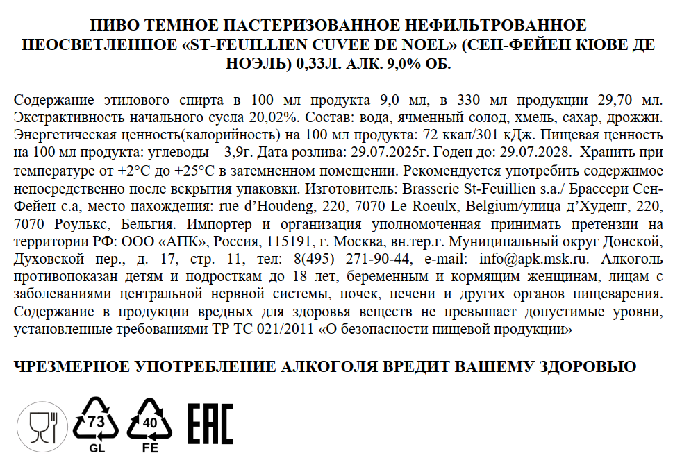 Пиво St-Feuillien Cuvee De Noel темное нефильтрованное, 0.33л