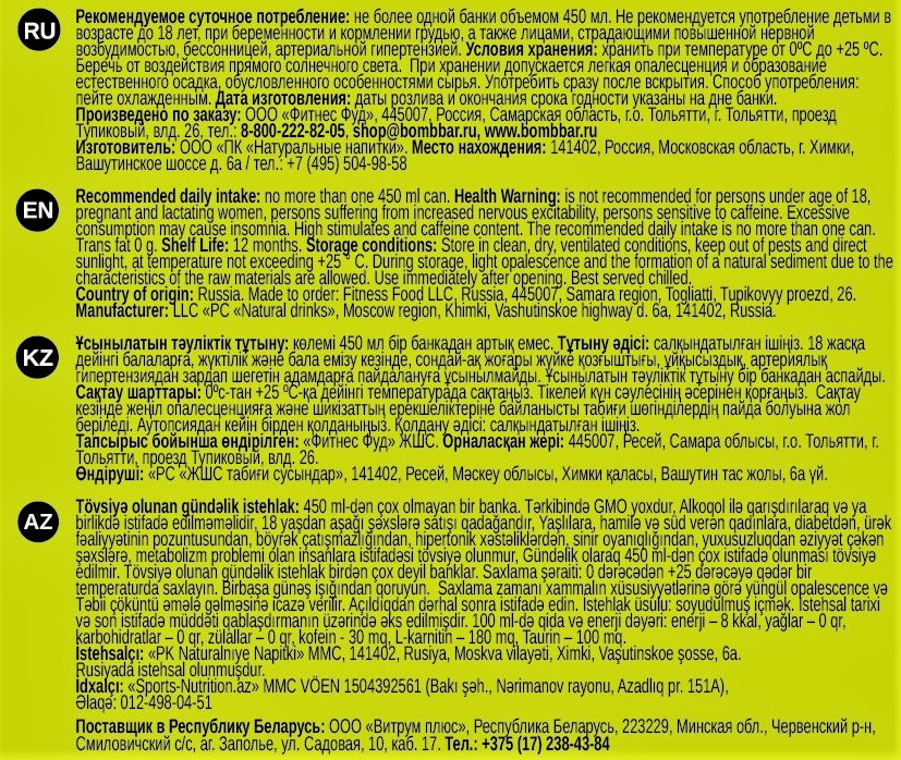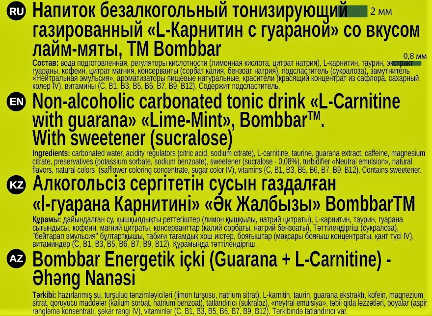 Напиток Bombbar L-карнитин с гуараной лайм и мята газированный, 450мл