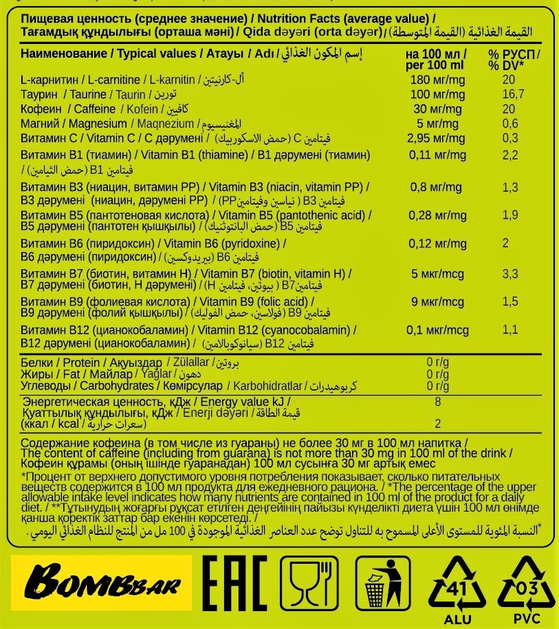 Вода подготовленная, регуляторы кислотности лимонная кислота, цитрат натрия 3-замещенный, L-карнитин, таурин, ароматизаторы гуммиарабик, эфиры глицерина и смоляных кислот, красящий концентрат из сафлора, антиокислитель токоферолы, концентрат смеси, краситель сахарный колер IV, таурин, экстракт гуараны, подсластитель сукралоза, магния цитрат, консерванты сорбат калия, бензоат натрия, витамины С, В1, В3, В5, В6, В7, В9, В12.