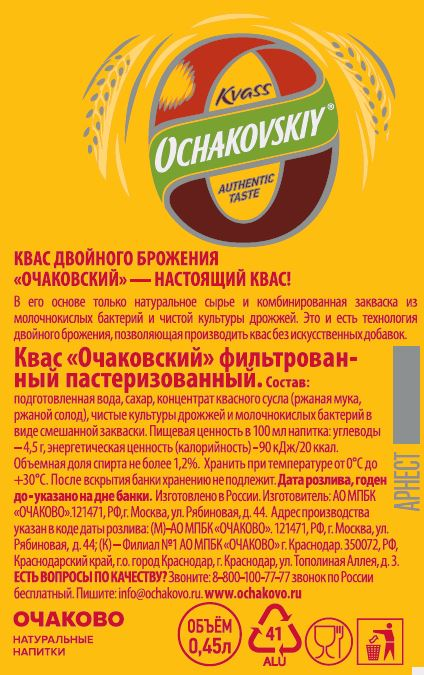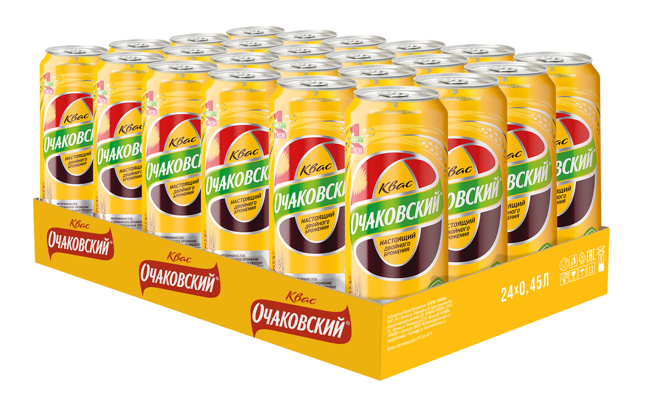 Сегодня Очаковский - единственный настоящий традиционный квас от крупного производителя, изготавливаемый по классической технологии двойного брожения. Подлинная технология ставит квас Очаковский вне конкуренции, поскольку остальные крупные компании производят свои напитки по упрощённой технологии, без традиционного молочнокислого брожения. Традиционный русский напиток, темный квас натурального брожения, созданный из натуральных ингредиентов без использования консервантов. Квас отлично освежит жарким днем, его можно употреблять в течение всего дня.