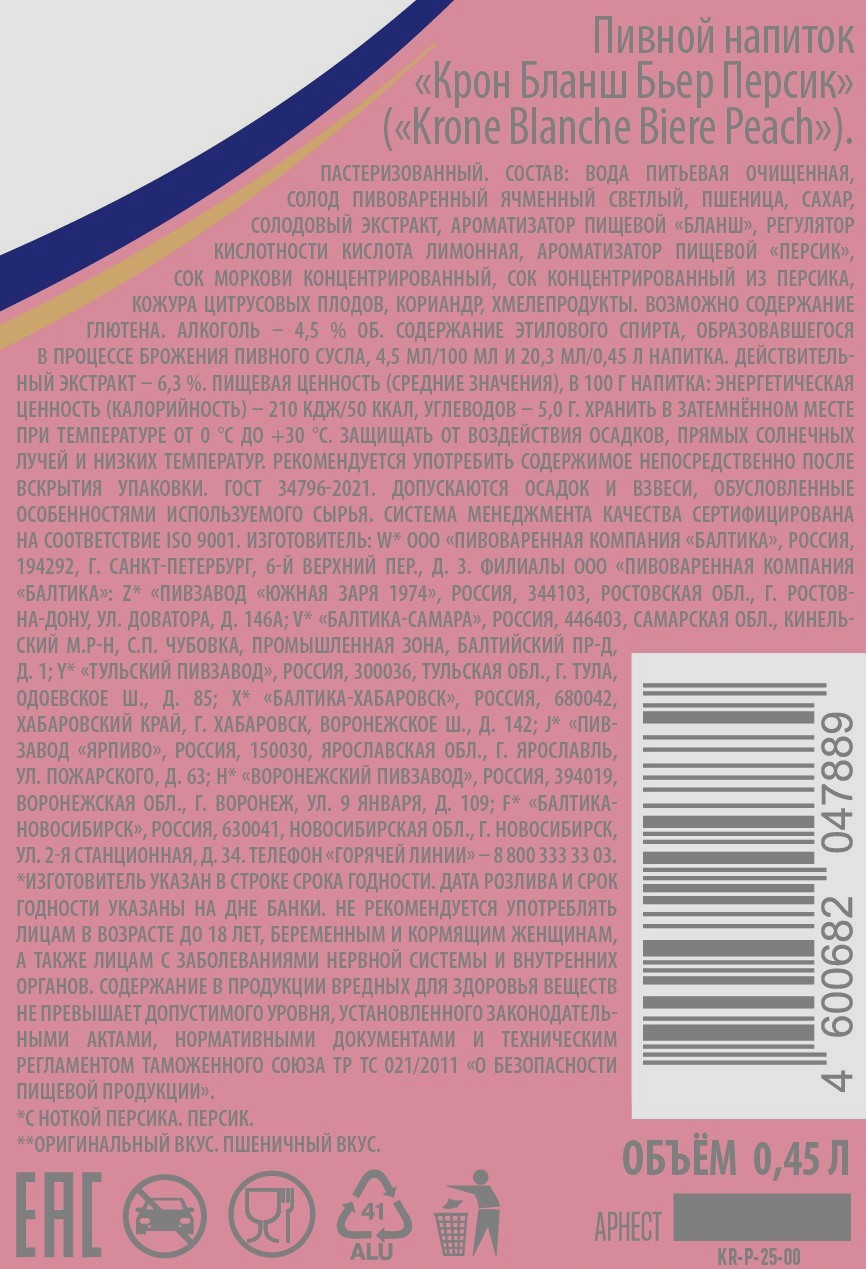 Пивной напиток Krone Blanche Biere персик, 0.45л