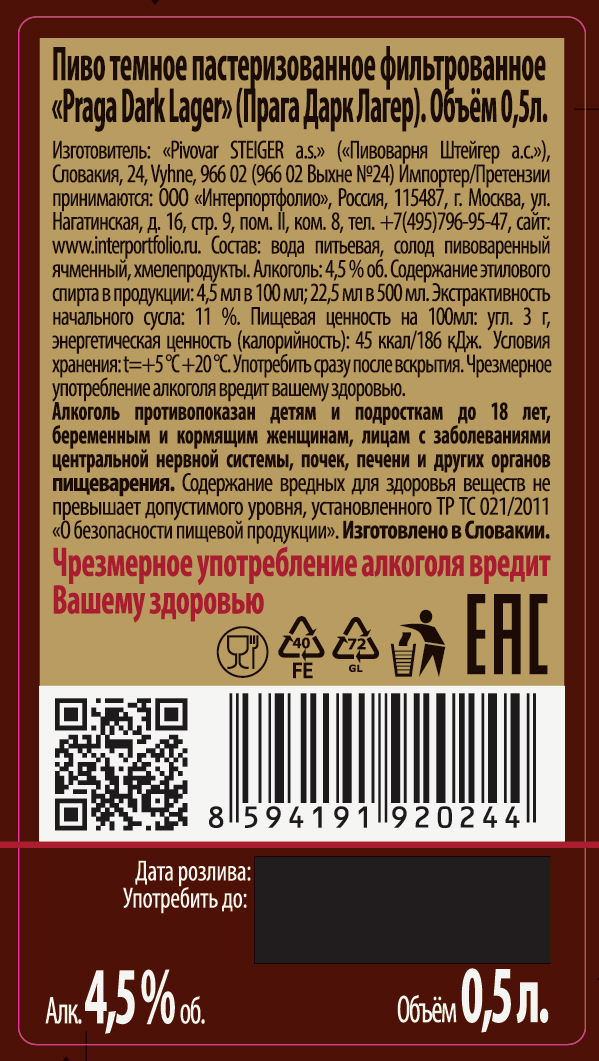 Пиво темное пастеризованное фильтрованное Praga Dark Lager (Прага Дарк Лагер). Насыщенный темный лагер со сложным и многослойным ароматом и нотками карамельной сладости во вкусе. Он варится исключительно из хмеля, ячменного солода и чистой воды. Это пиво характеризуется искристой карбонизацией, каштановым цветом и пышной белоснежной пеной.