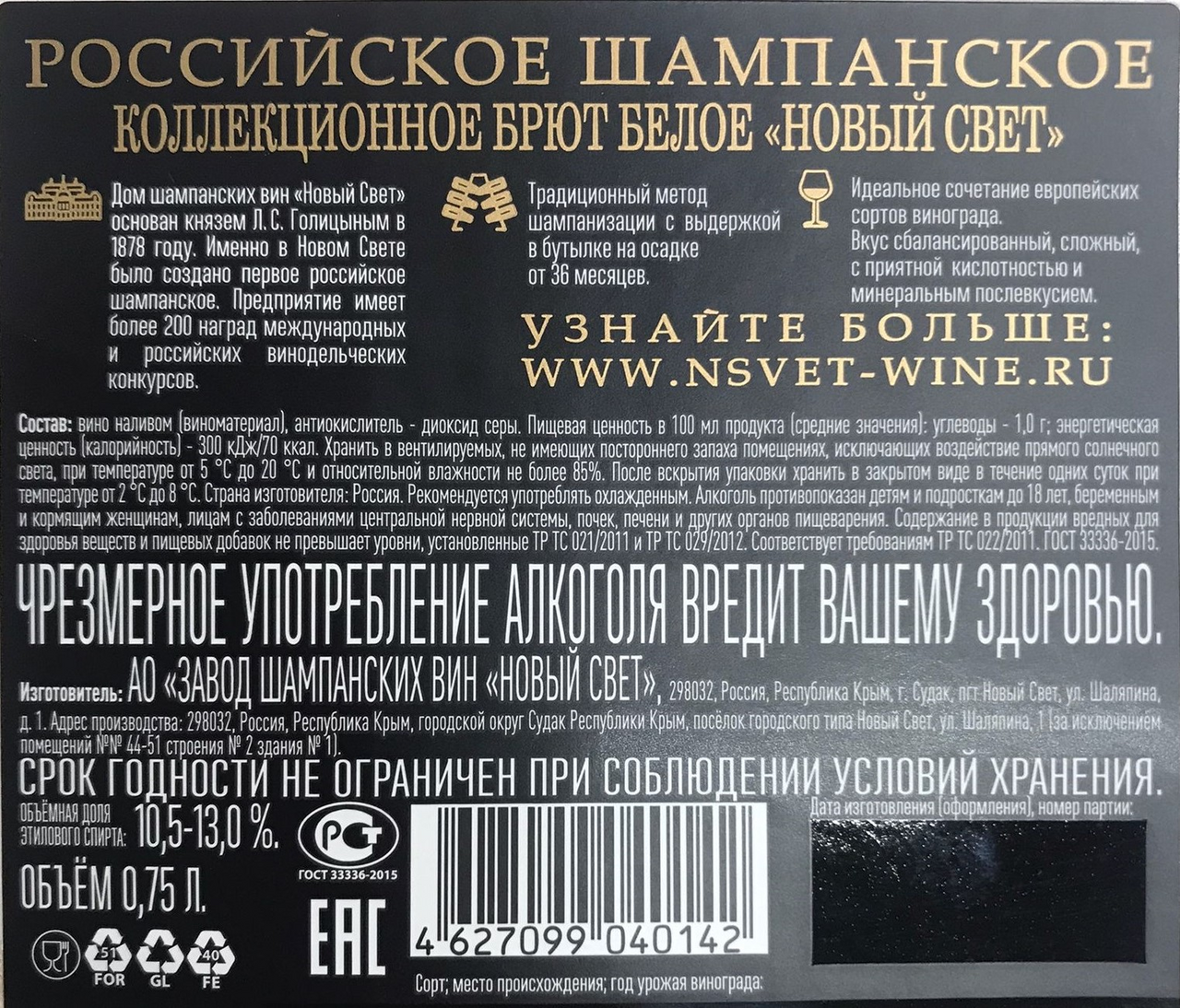 Шампанское российское Новый Светъ Коллекционное брют белое, 0.75л