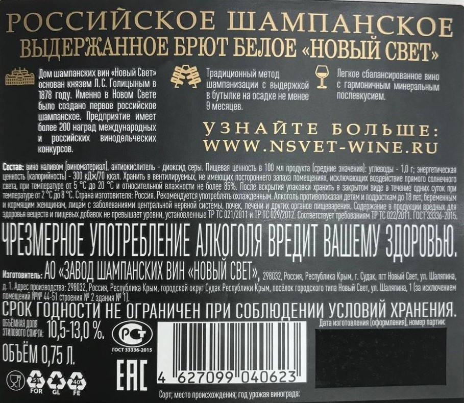 Прекрасный образец классического шампанского, воссозданный по рецептуре князя Голицына. Высокое качество шампанского Новый Свет брют подтверждено многочисленными наградами международных конкурсов. При производстве используется сок только первого отжима — кюве. Вино выдерживается на осадке не менее 36 месяцев в тоннелях конца XIX века при постоянной температуре +14С. Технологические операции: перекладка, ремюаж и дегоржаж — проводятся вручную.