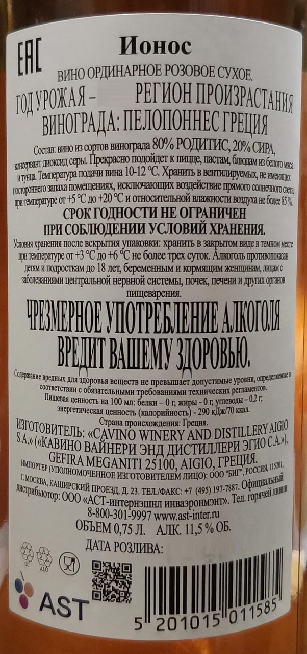 Компания Cavino S.A. была основана в 1958 году в городе Эгио на п-ове Пелопоннес Константином Анастасиус и Иоаннисом Дускасом. Сегодня Cavino, являясь национальным лидером по производству и экспорту вин. Ежегодный объем производства вина составляет 8,5млн бутылок. Компания была удостоена наградой Лучшая винодельческая компания Греции The Best Greek Winery в 2009 году журналом IWS. Cavino сертифицирован по стандартам качества ISO и IFS, обеспечивая высокий уровень качества продукции. Новая полностью автоматизированная ультрасовременная линия розлива была введена в работу в 2010 году, производя до 7000 бутылок в час и устанавливая новые стандарты качества и доказывая лидирующие позиции компании на греческом рынке вина. Современные возможности, уникальный опыт и квалифицированная команда специалистов по производству, логистике, маркетингу и продажам позволяют Cavino уверенно смотреть в будущее и отвечать всем вызовам современности. Для производства розового сухого вина Ionos производитель использует виноград сортов Сира и Родитис, произрастающий на виноградниках, расположившихся на склонах Эгилии и Немеи. Оба сорта собирают в конце сентября. Виноград транспортируют на винодельню, где его предварительно подготавливают к ферментации: сортируют и прессуют. Сначала ягоды подвергают мацерации на кожице, которая длится 5 часов. Алкогольную ферментацию осуществляют при низких температурах. Выдержка вина на осадке длится 2 месяца, после чего вино фильтруют и бутилируют. Вино отлично сочетается с блюдами из белого мяса, рыбой, особенно тунцом, разнообразными пастами и пиццей.