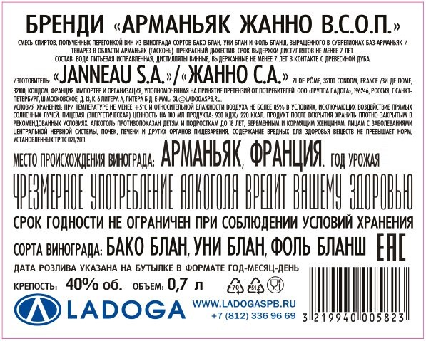 Janneau, лидирующая марка в категории Арманьяк. Janneau, первая марка Арманьяка в секторе Duty Free в Европе. Присутствует в 70 странах. Janneau самый титулованный арманьяк. Cимвол стиля дома Janneau, VSOP Audace - это идеальный бленд тщательно отобранных о-де-ви (спиртов), минимальный возраст выдержки которых составляет 7 лет. VSOP - это бленд спиртов, дистиллированных из белых вин, которые получены из сортов Бако, Уни Блан и Фоль Бланш. Виноград выращен в двух основных областях с контролируемыми наименованиями: Ба-Арманьяк и Тенарез. Это также сочетание двух разных типов перегонки: двойной дистилляции в перегонных кубах (особенность дома Janneau) и однократной перегонки в арманьячном аламбике.