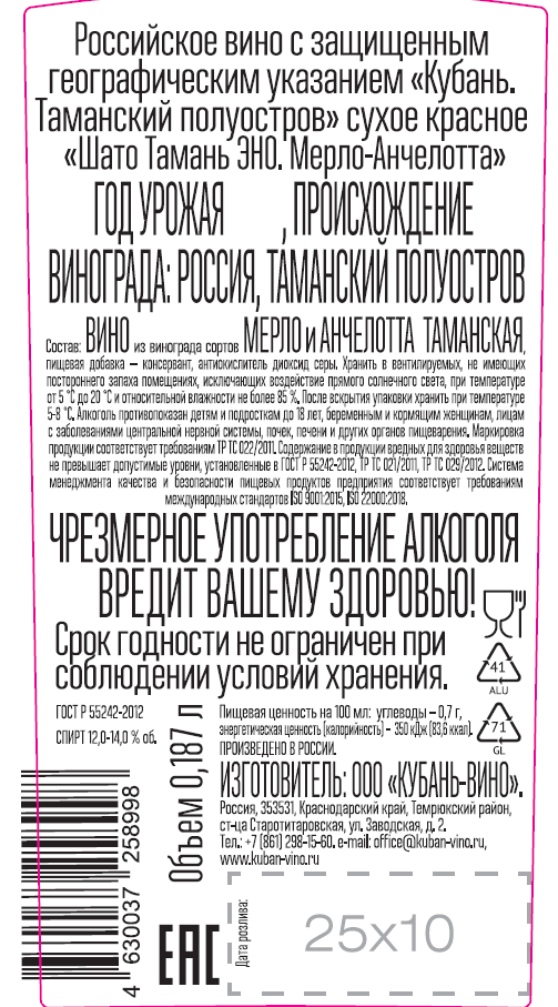 Виноград сортов Мерло, Анчелотта Таманская, пищевая добавка-консервант антиокислитель диоксид серы.