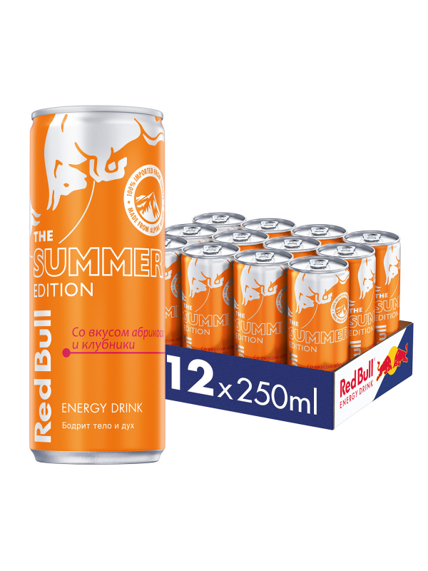 Red Bull Summer Edition с ярким вкусом абрикоса и клубники. Содержит кофеин, оказывающий стимулирующее действие на организм человека, и таурин.