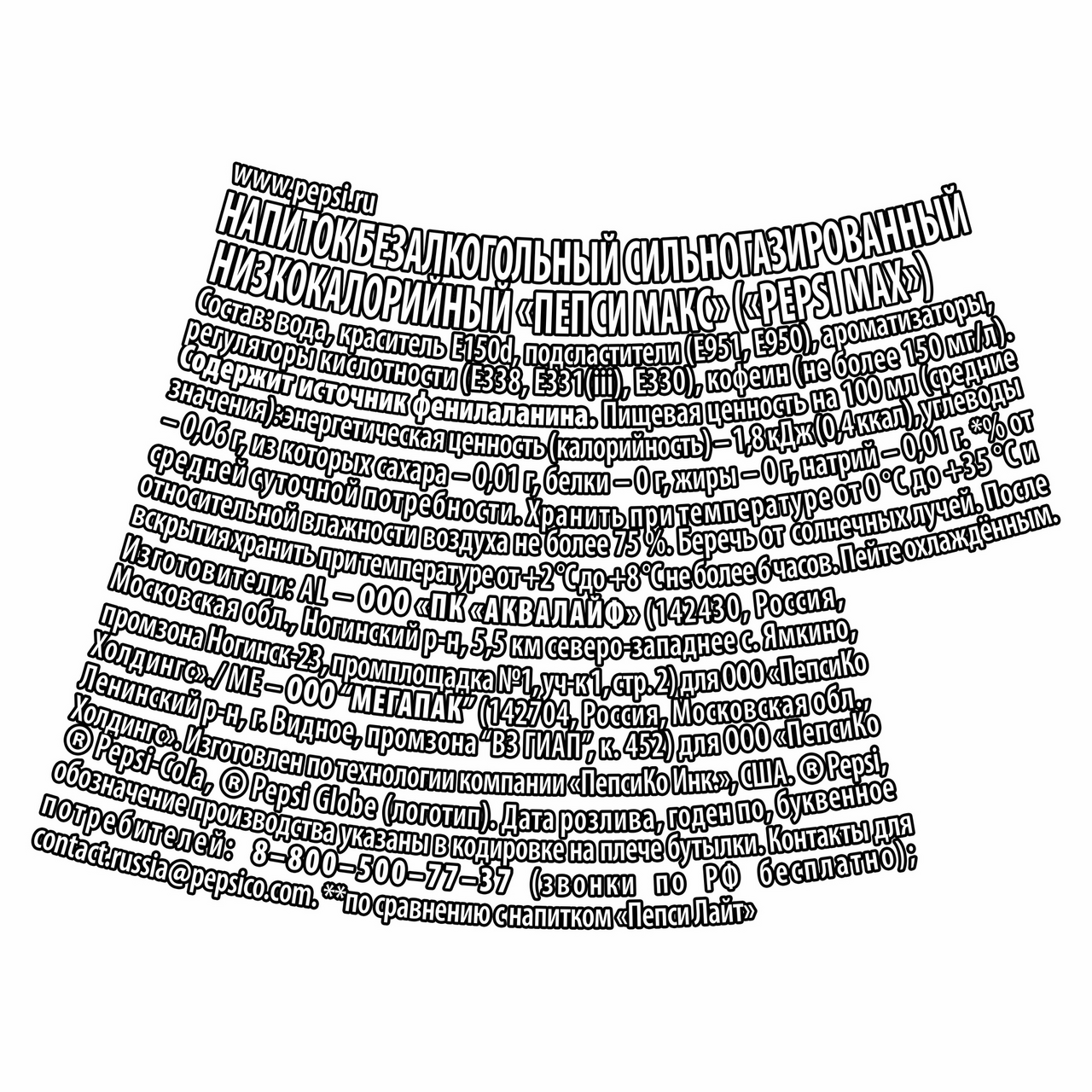Напиток Пепси Макс - диетическая версия известного на весь мир безалкогольного прохладительного напитка без сахара и калорий (всего 1.2ккал на 100г)●Максимально насыщенный вкус коллы без сахара●Освежающий●Для отличного настроения и бодрости весь день●Без калорийПепси Кола - легендарный напиток, изобретенный фармацевтом К. Бредхемом в 1893 году. Pepsi завоевал популярность по всему миру.