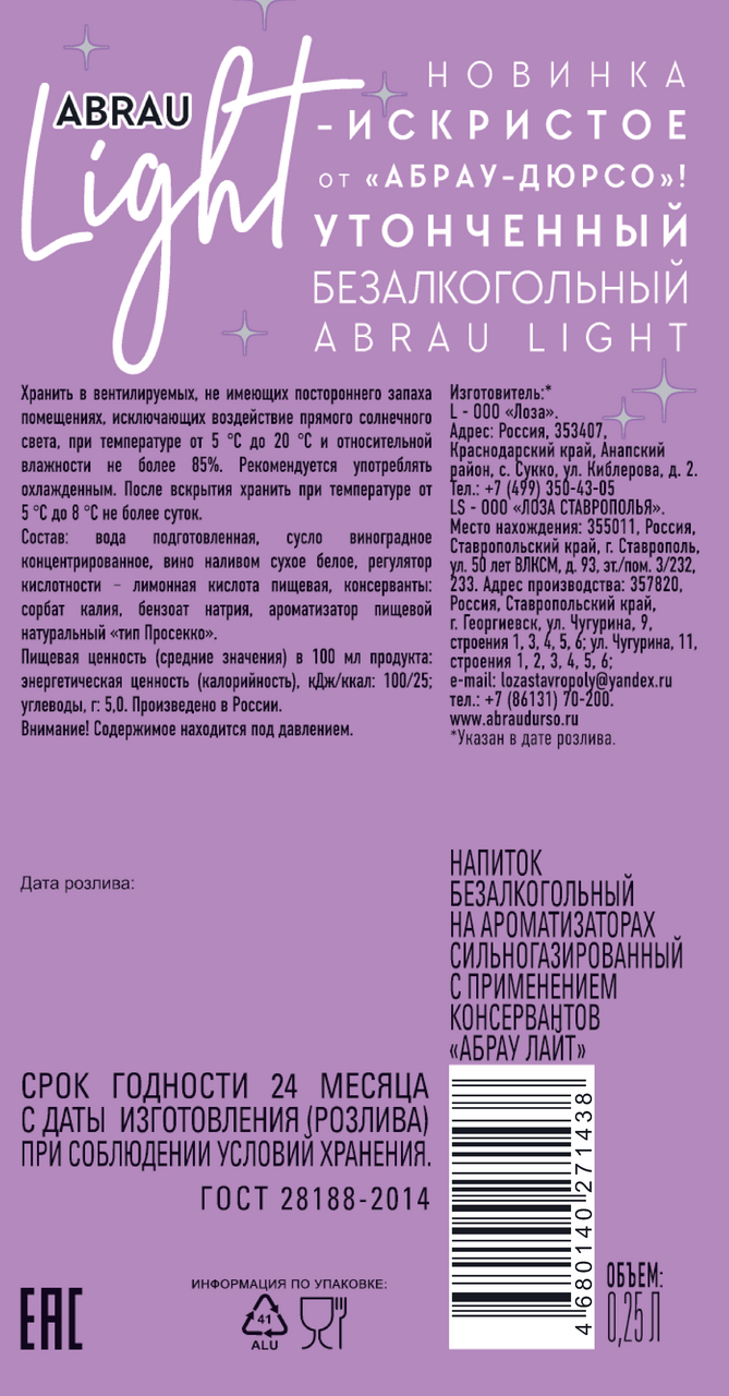 Напиток Абрау Дюрсо Light Zero белый полусладкий безалкогольный газированный, 0.25л