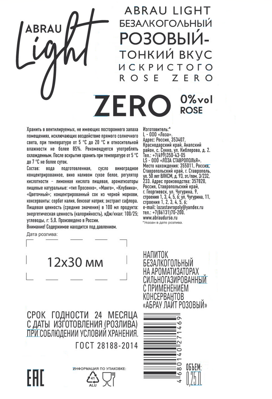 Напиток Абрау Дюрсо Light Zero розовый полусладкий безалкогольный газированный, 0.25л