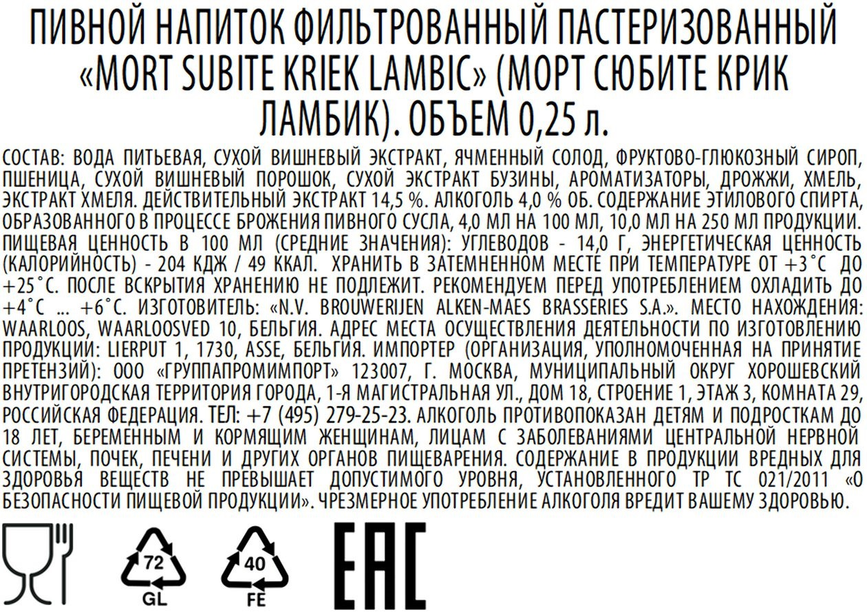 Пиво Dr. Mort Subite Lambic Kriek, 0.25л