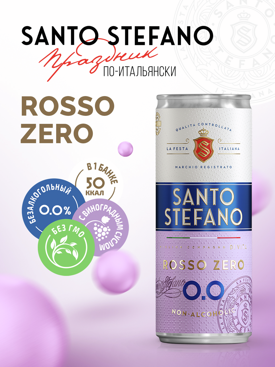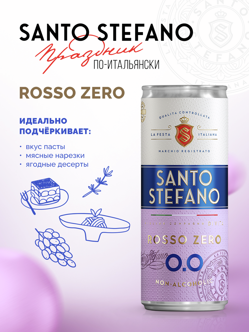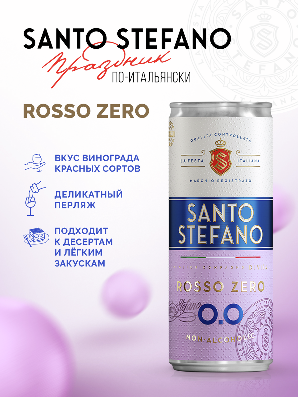 Наслаждайся без ограничений! Santo Stefano Zero Rosso - красное полусладкое безалкогольное игристое. Всем любителям шампанского и тем, кто любит безалкогольное игристое вино, понравится новинка от легендарного бренда — изысканное безалкогольное игристое в удобном формате банки объемом 0,25л. Идеальный напиток 0% для ценителей ЗОЖ, водителей и тех, кто не пьет алкоголь. Санто Стефано Россо — это красное полусладкое безалкогольное игристое, которое покоряет с первого глотка. Напиток обладает ярким вкусом соррентийского винограда с легкими ягодными оттенками. Игристый перляж раскрывает полноту вкуса и оставляет свежее выразительное послевкусие. Это вкусное, с деликатными пузырьками, красное игристое без алкоголя оценят даже самые взыскательные гурманы. Минимум калорий и максимум удовольствия! Идеально для любого повода: Новый год, свадьба, день рождения, корпоратив или романтический вечер. Нас выбирают беременные и те, кто за рулем. Дарите себе и близким праздник без последствий и похмелья! Наслаждайтесь каждым моментом без ограничений с Santo Stefano Zero!