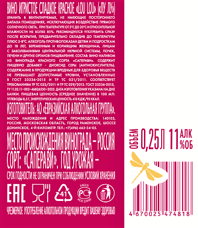 Вино игристое сладкое красное. Изготовлено из винограда красных сортов, выращенного в России.Цвет насыщенный рубиновый с гранатовыми отблесками. Яркий фруктовый аромат с преобладанием тонов малины и клубники великолепно оттенен приятной сладостью вкуса. Послевкусие долгое, слегка танинное. Прекрасно подойдет к выпечке, фруктовым десертам. Рекомендуется подавать при температуре 9-11С. Сочное и яркое игристое вино, созданное из красных сортов винограда и покоряющее мягкой фруктовой сладостью. Высококачественное сырье и современное оборудование позволяют создать питкий и легкий напиток с ярким вкусом. Лу Лу всегда можно взять с собой благодаря компактной жестяной банке с красочным и современным дизайном.