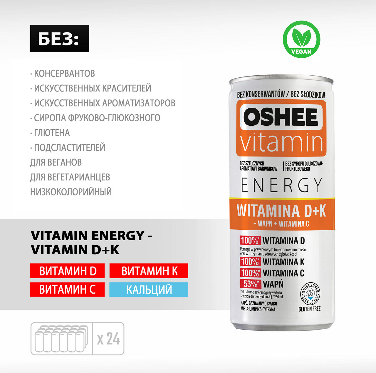 Напиток с освежающим вкусом мяты, лимона и лайма. В одной баночке содержится дневная доза важнейших витаминов: витамина С, D и К, а еще кальций и экстракт Женьшеня. Подходит для веганов и для вегетарианцев. Приобрести Напиток Oshee витаминный витамины D+K, 250мл можно в торговом центре METRO.