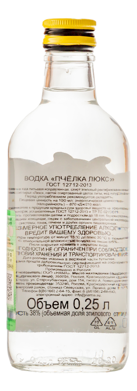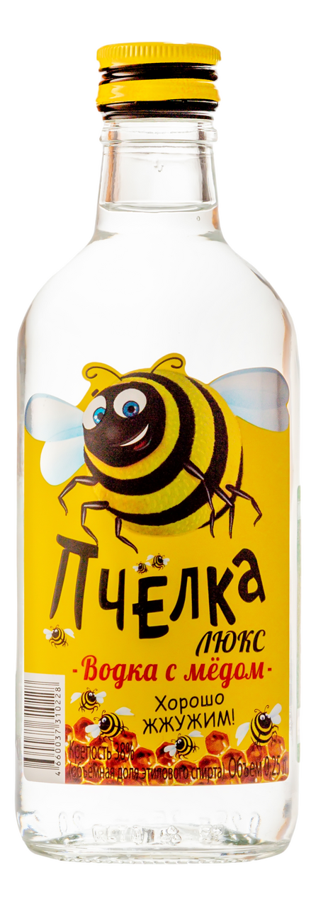Водка Пчелка Люкс 0.25л - классическая водка, изготовленная исключительно из натуральных ингредиентов: воды из собственной артезианской скважины глубиной 600 метров, спирта класса Люкс, спиртованного настоя липового цвета и меда. Водка обладает мягким, сладковатым вкусом. Этикетка водки украшена изображением симпатичной пчелки, что полностью соответствует концепции бренда.