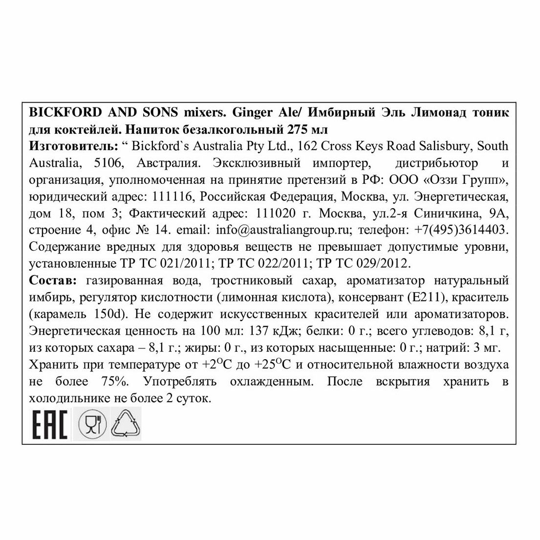 Газированная вода, тростниковый сахар, ароматизатор натуральный имбирь, регулятор кислотности (лимонная кислота), консервант (E211), краситель (карамель 150d).