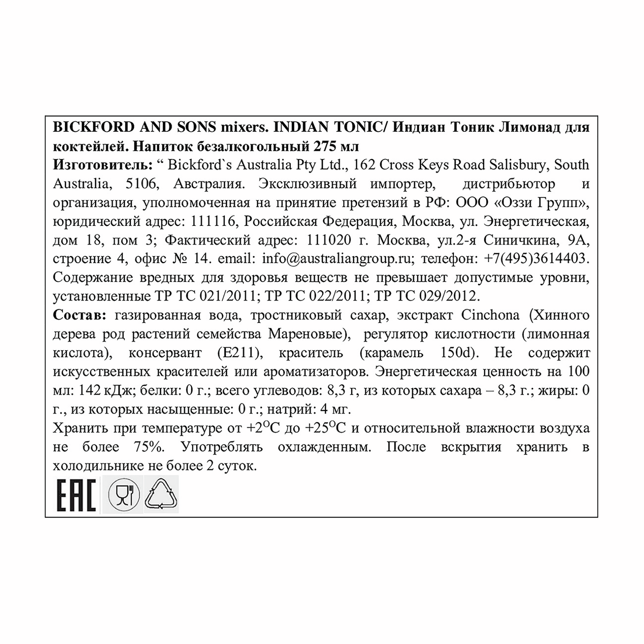 Напиток Bickfords газированный Indian tonic, 0.275л