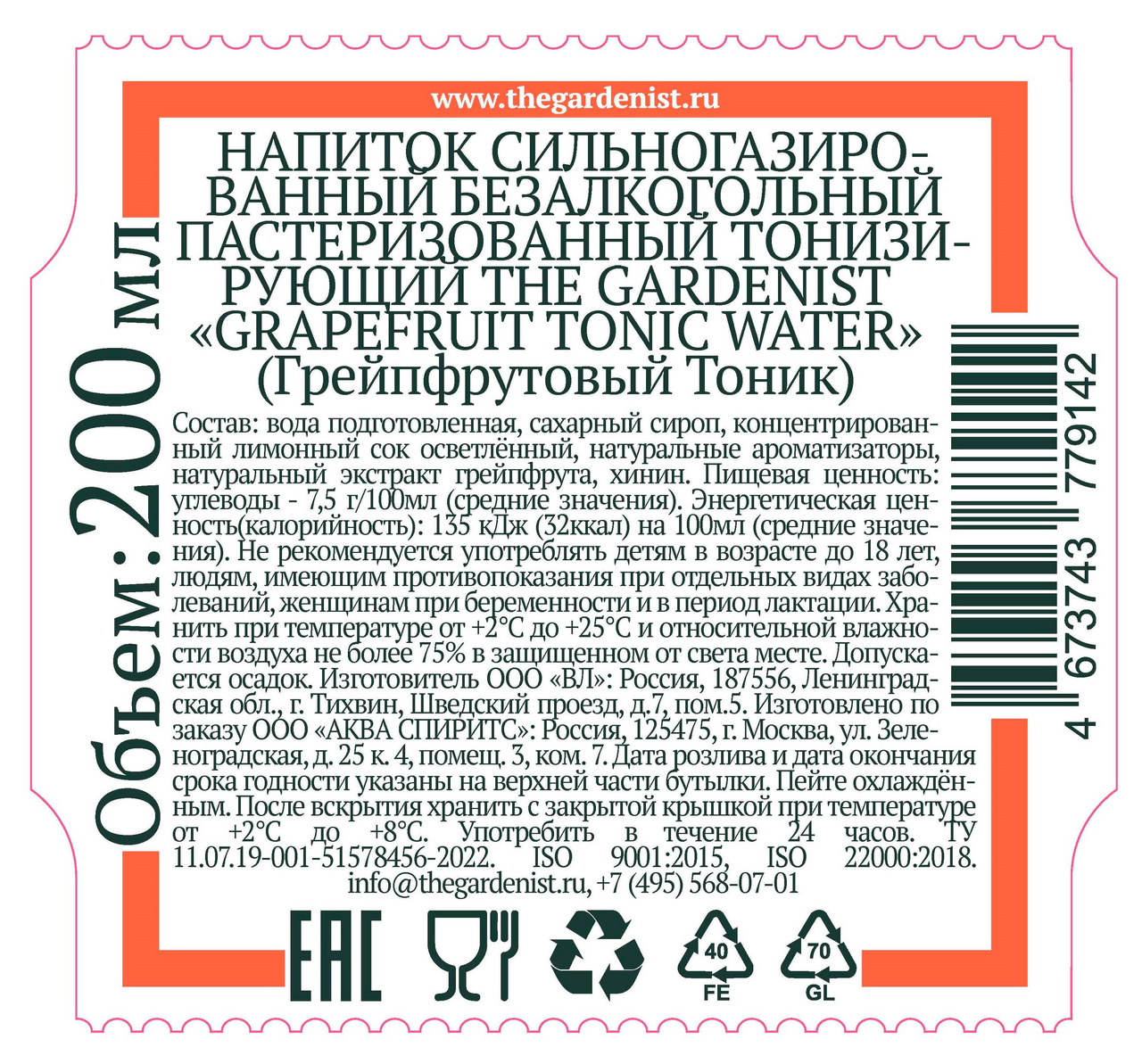 Напиток The Gardenist грейпфрут тоник газированный, 200мл