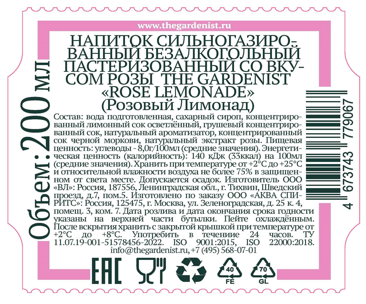 Очень тонкий лимонад с превосходным цветочным вкусом. Натуральный экстракт крымской розы придаёт напитку благородную ноту, а сок лимона естественную кислинку. Напиток прекрасен в чистом виде со льдом, а также в составе простых коктейлей с игристыми винами, вермутами и винными аперитивами. Рекомендуем подавать охлаждённым.