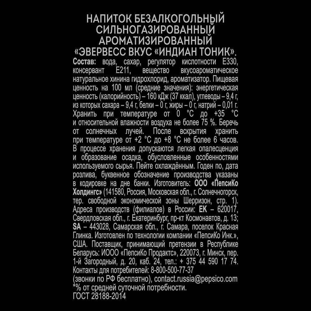 Вода, сахар, регулятор кислотности Е330, консервант Е211, вещество вкусоароматическое натуральное хинина гидрохлорид, ароматизатор.
