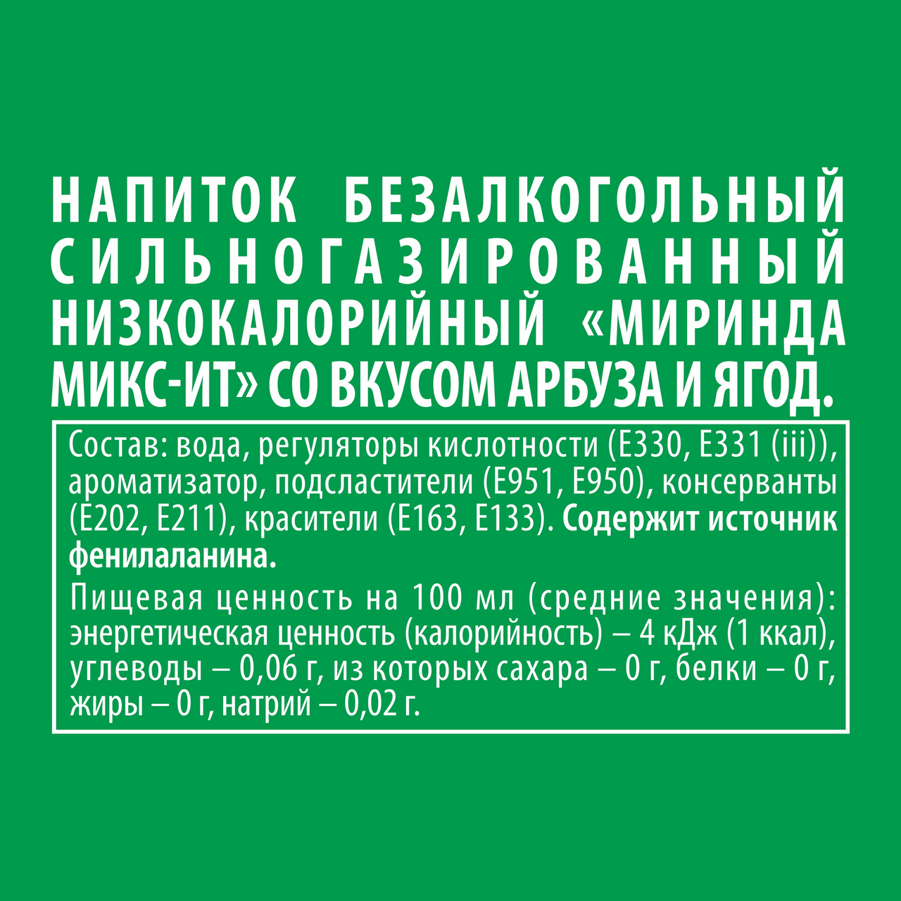 Mirinda Mix-It смело миксует яркие, неожиданные вкусы и ароматы, удивляя тебя. Лови вкусоворот! ●Вот это микс! Вкус арбуза и ягод! Лови вкусоворот!●Попробуй прямо сейчас!В ассортименте Mirinda классический вкус апельсина с натуральным апельсиновым соком и линейка Mix-It с неожиданными и яркими вкусовыми сочетаниями. Стремясь удивлять и вдохновлять своих потребителей, Mirinda каждый год представляет лимитированные коллекции упаковок с веселыми дизайнами. Не пропусти и собери всё!О бренде: Mirinda появилась в горячей Испании в 1959 году, и в переводе с эсперанто название означает "достойный удивления". Яркий вкус напитка позволяет убедиться, что Mirinda действительно способна удивлять!