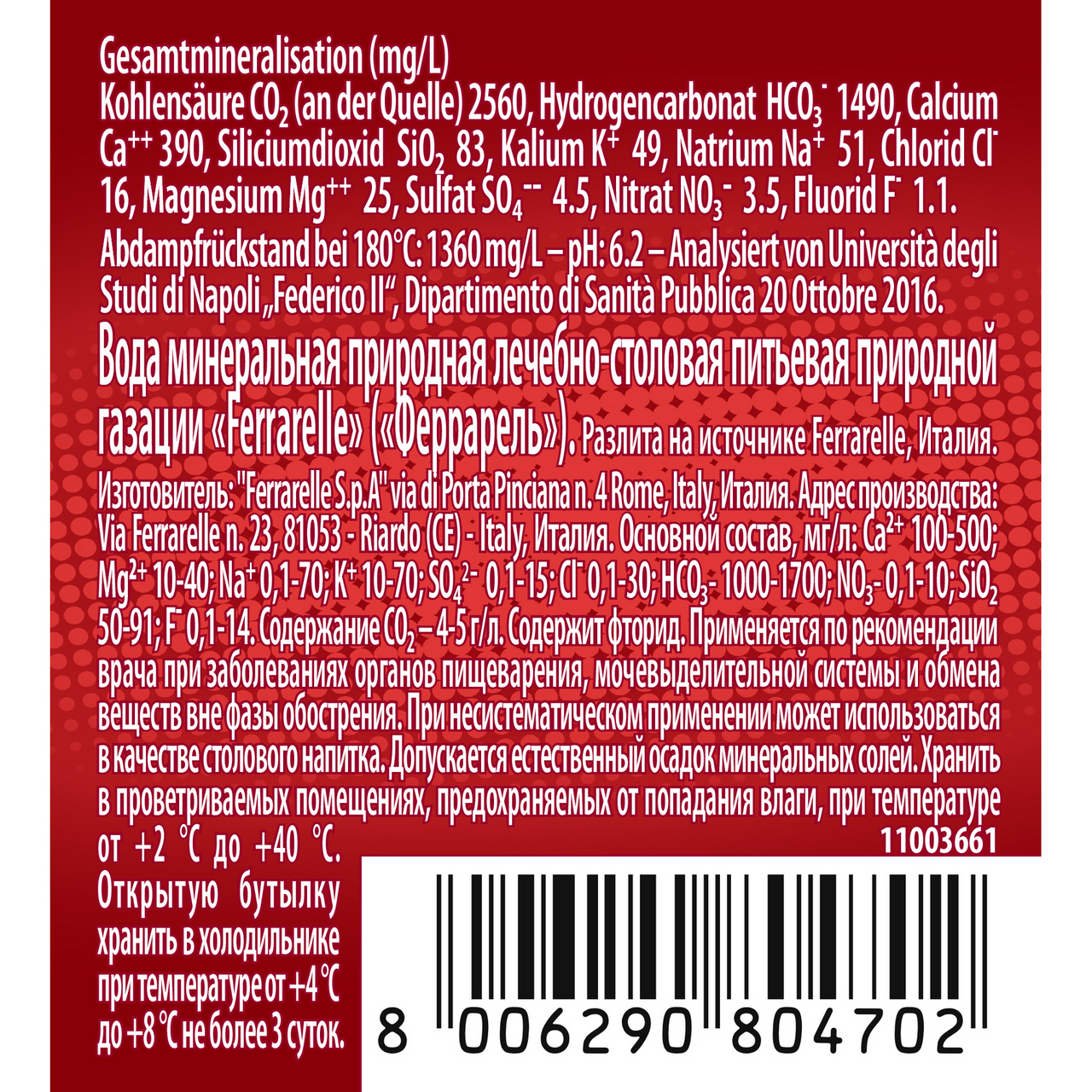 Вода минеральная природная лечебно-столовая питьевая природной газации Ferrarelle.Настало время открыть для себя Ferrarelle!Возьмите всю жизнерадостность средиземноморской культуры, добавьте немного жизненной силы и изобилия Италии, смешайте её со всей подлинностью юга Италии, сделайте её искрящейся и вкусите лучшее с Ferrarelle!Минеральная вода разлита на источнике Ferrarelle, Италия