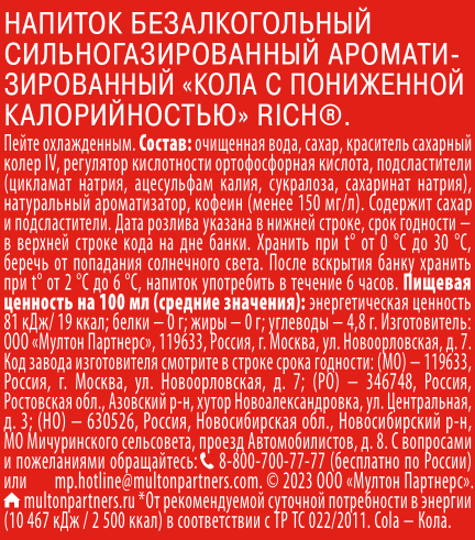 Напиток Rich Кола газированный, 330мл x 12шт освежающий безалкогольный сильногазированный напиток со всеми любимым вкусом колы. Напиток изготавливается из натуральных ингредиентов с добавлением кофеина и экстракта ванили, за счет которых напиток получает не только культовый вкус, но и приятный, легкий тонизирующий эффект. Напиток можно употреблять в течение всего дня охлажденным, а также использовать для приготовления коктейлей.