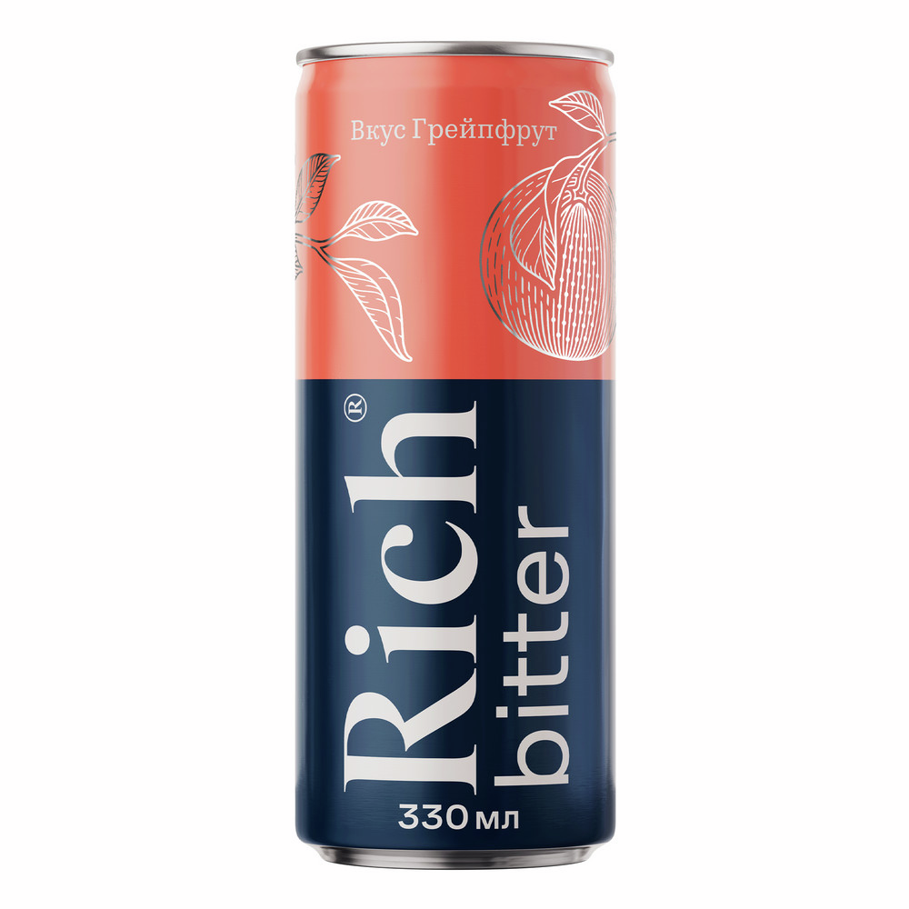 Напиток Rich Bitter грейпфрут, 330мл x 12 шт - сильногазированный безалкогольный, прекрасно освежающий напиток с тонкой кислинкой грейпфрута. Напиток производится из очищенной воды с добавлением сахара, лимонной кислоты, экстракта моркови, натуральных ароматизаторов и хинина, который придает напитку его пикантную горчинку. Напиток чаще всего используется в составе разнообразных коктейлей, но также им можно освежиться в чистом виде или со льдом в течение дня. Изысканный биттер с освежающим вкусом грейпфрута, оттененный фирменной горчинкой хинина. Прекрасно подходит для самостоятельного потребления, а также для приготовления коктейлей с грейпфрутовыми нотами с джином, водкой, вермутами.