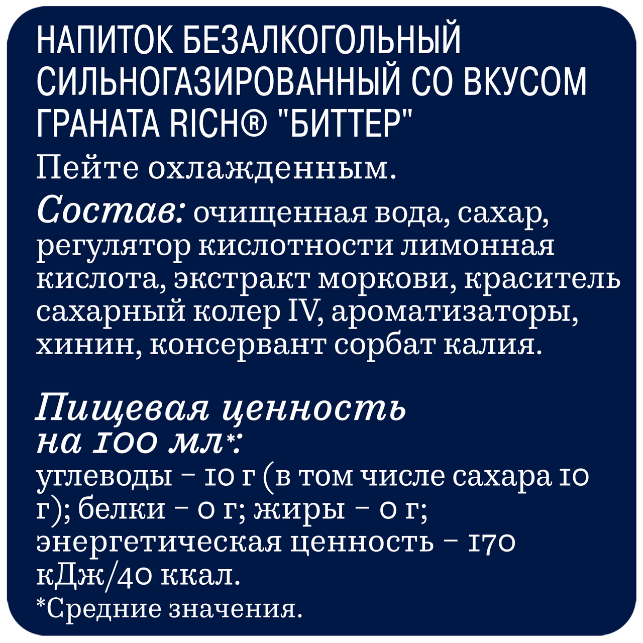 Rich Tonic&Bitter – это сильногазированные напитки высокого качества с особенным вкусом для настоящих ценителей. Rich Bitter Гранат – фруктовый вкус изысканного граната в сочетании с горьковатой нотой хинина. Отлично подойдет как самостоятельный напиток, так и в качестве ингредиента для коктейлей. Устрой встречи со вкусом!