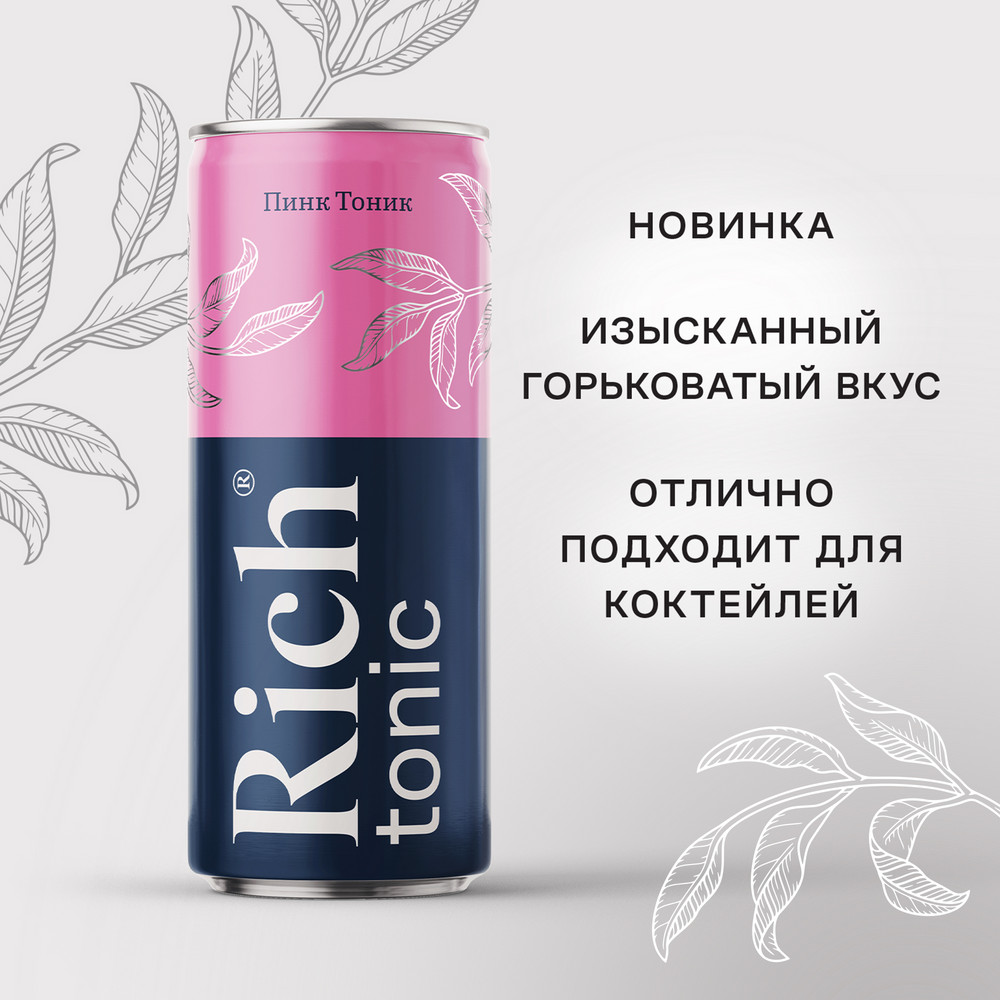 Напиток газированный Rich Pink Тоник, 330мл x 12 шт - это сильногазированные напитки высокого качества с особенным вкусом для настоящих ценителей. Это так же изысканный горьковатый вкус тоника, оттененный нотами ягод и гибискуса. Отлично подойдет в качестве ингредиента для коктейлей