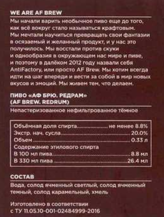 Создание сорта было приурочено ко дню открытия пивного бара с одноименным названием Redrum в Санкт-Петербурге. На впечатляющей и зловещей этикетке узнаваемый любым киноманом кадр из фильма Сияние Стенли Кубрика по произведению Стивена Кинга. Кровавый оттенок пива звучит в унисон с оформлением бутылки. При сухом охмелении используются хмели сортов Citra и Centennial, которые наделяют пиво исключительно мощным, взрывным, ярким ароматом и внушительной крепкой горчинкой.