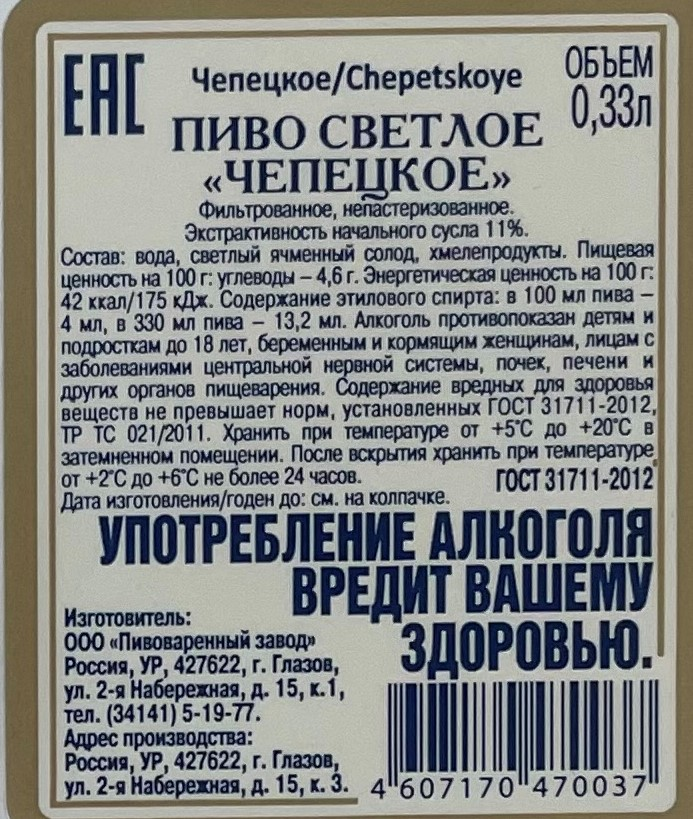 Пиво Чепецкое светлое, 0.33л