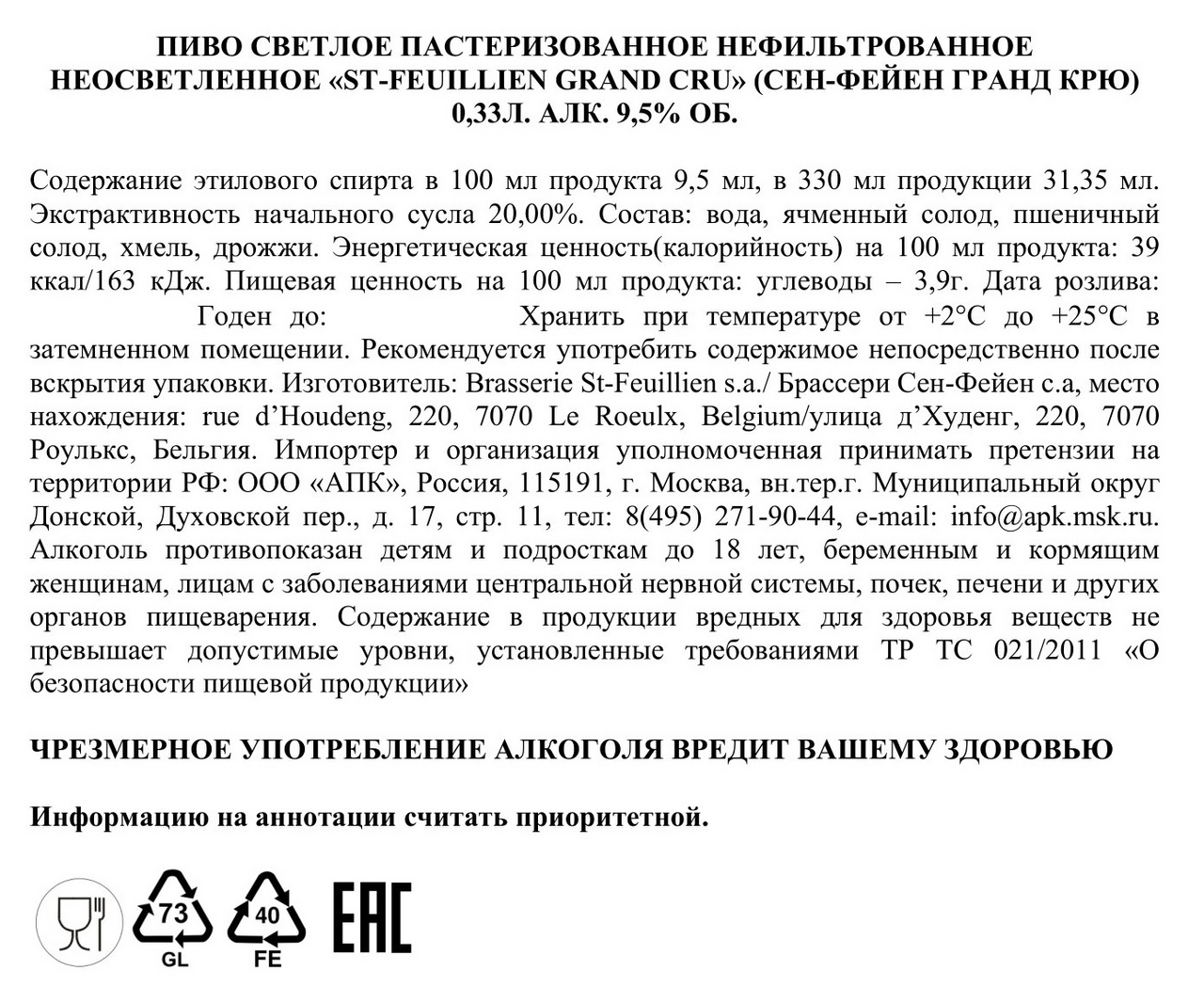 Пиво St-Feuillien Grand Cru светлое, 0.33л