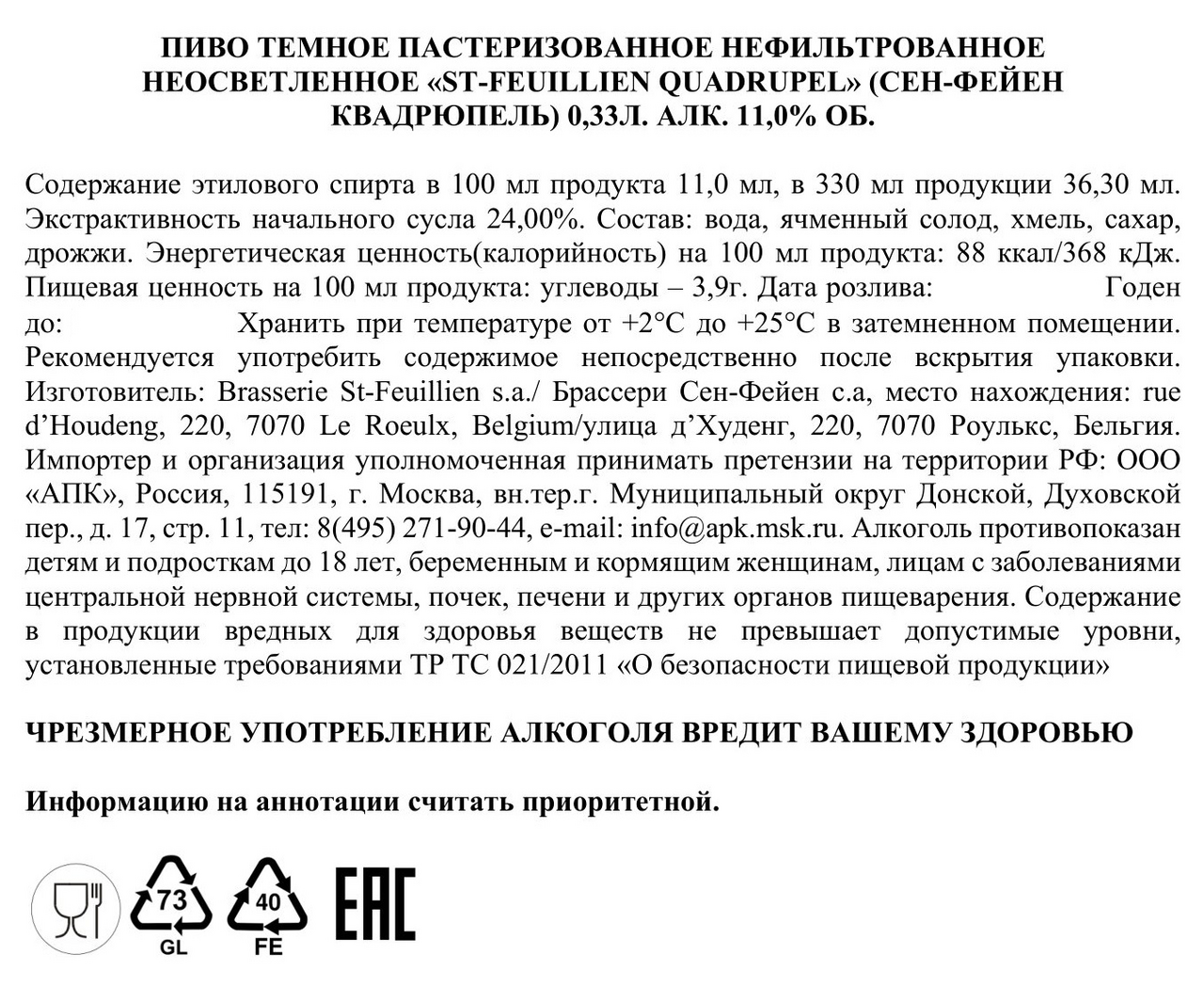 Пиво St-Feuillien Quadruple темное, 0.33л