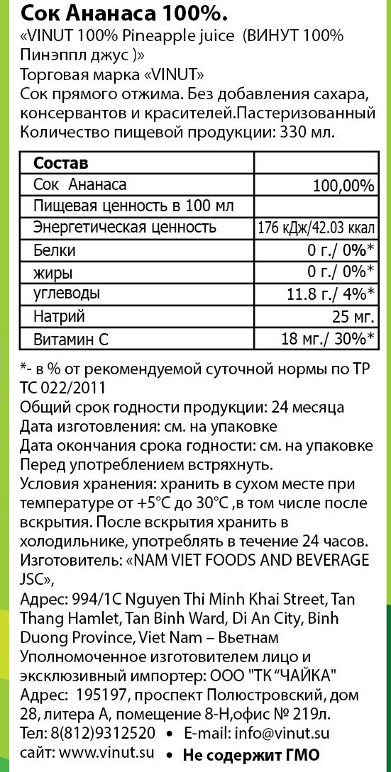 Сок прямого отжима ананаса, без добавления сахара и консервантов.