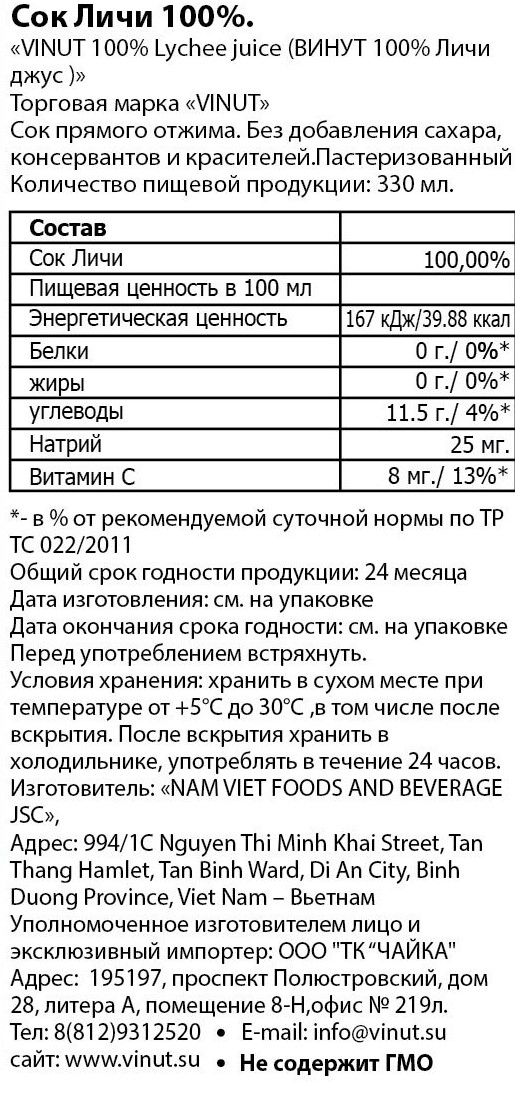 Сок прямого отжима личи 100%, без добавления сахара и консервантов.
