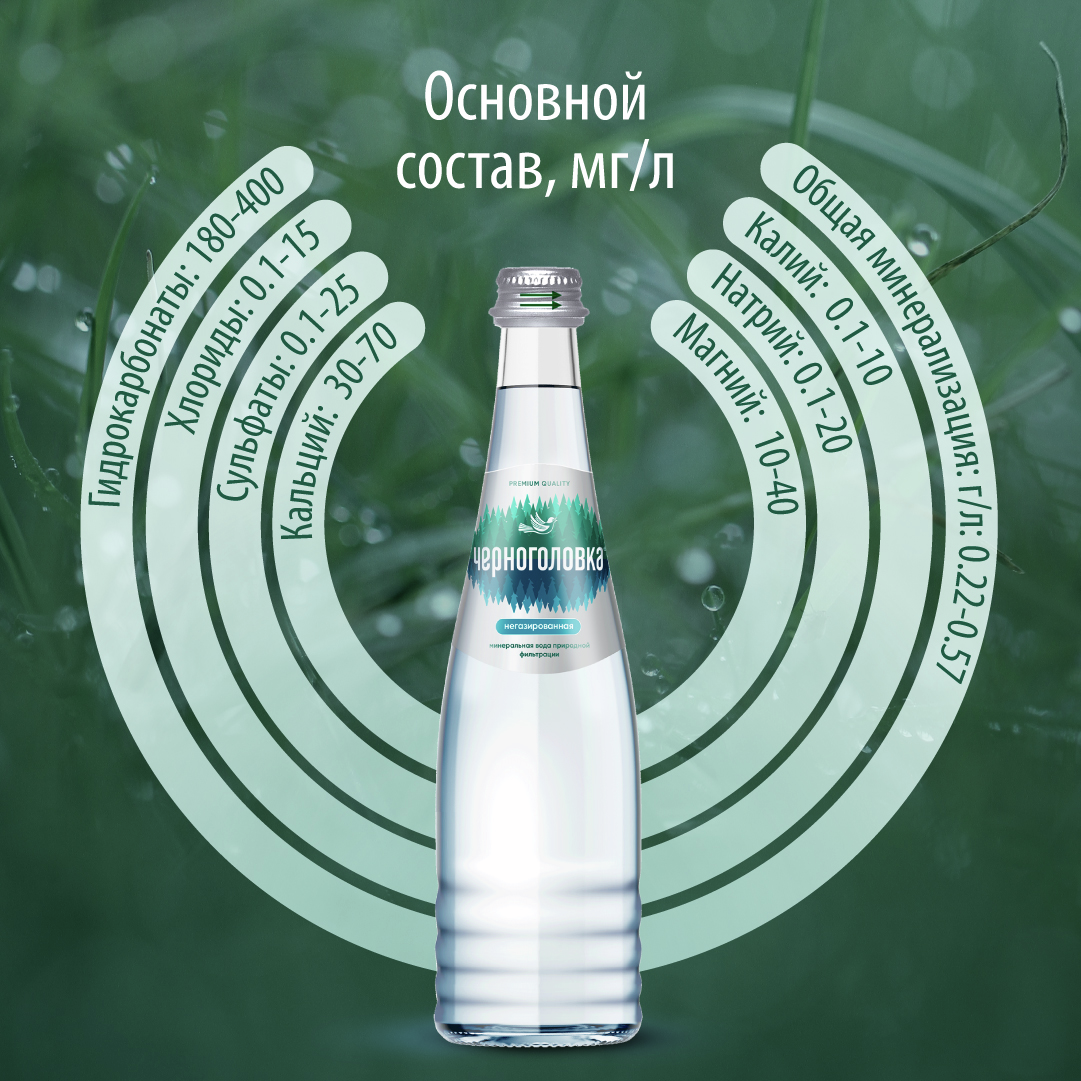 Черноголовка - вода для современных людей, живущих в режиме многозадачности, которым мы предлагаем воду, прошедшую природную фильтрацию, дающую вкус живой природы в городе и переключающую на природное состояние, в котором чувствуешь и фокусируешься на том, что по-настоящему важно. Каждая капля минеральной природной столовой воды Черноголовка негазированная очищается природными фильтрами, многовековыми слоями песка и обогащается полезными минеральными веществами, соотношение которых органично сбалансировано самой природой. Для особых случаев в стеклянной упаковке!