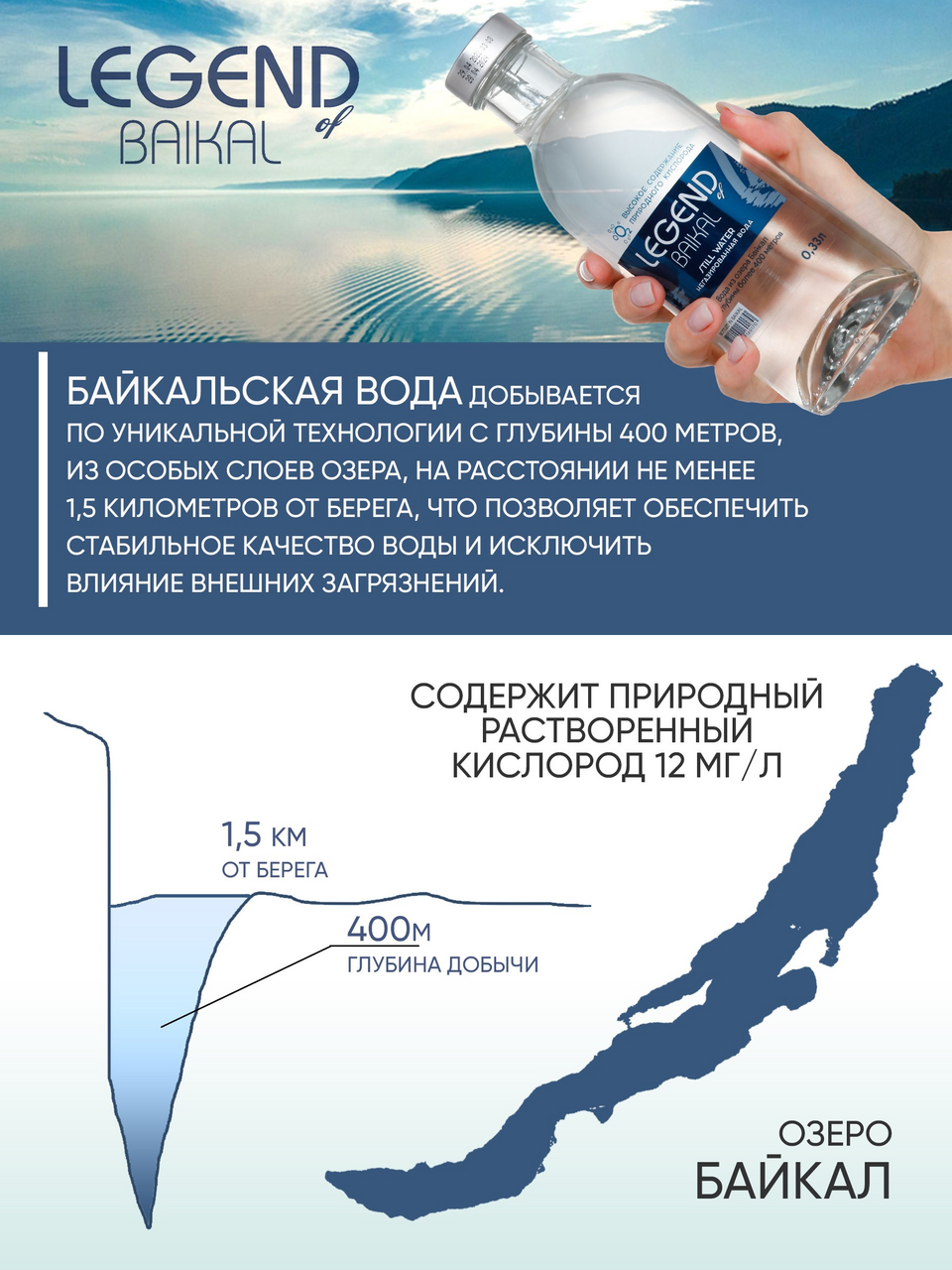 В��да добывается по запатентованной технологии с глубины 400 метров из особых слоев, насыщенных кислородом и не подверженных влиянию внешних загрязнений.Вода проходит очистку сохраняя натуральную природную минерализацию. Благодаря высокому содержанию природного кислорода (12 мг/л) вода Legend of Baikal активирует иммунную систему и обладает восстановительными свойствами для организма. Прошла множество исследований и соответствует всем мировым стандартам питьевой воды.