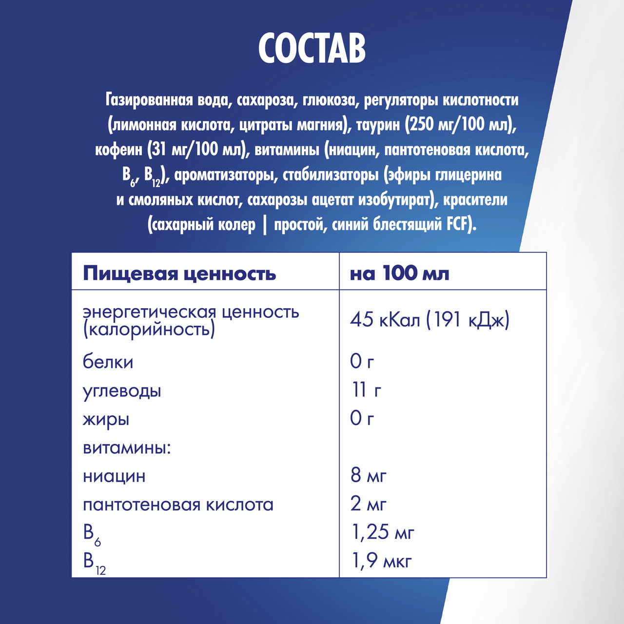 Газированная вода, сахароза, глюкоза, регуляторы кислотности (лимонная кислота, цитраты натрия) таурин, кофеин, витамины (ниацин, пантотеновая кислота, В6, В12) ароматизаторы, красители (антоцианы, рибофлавин).