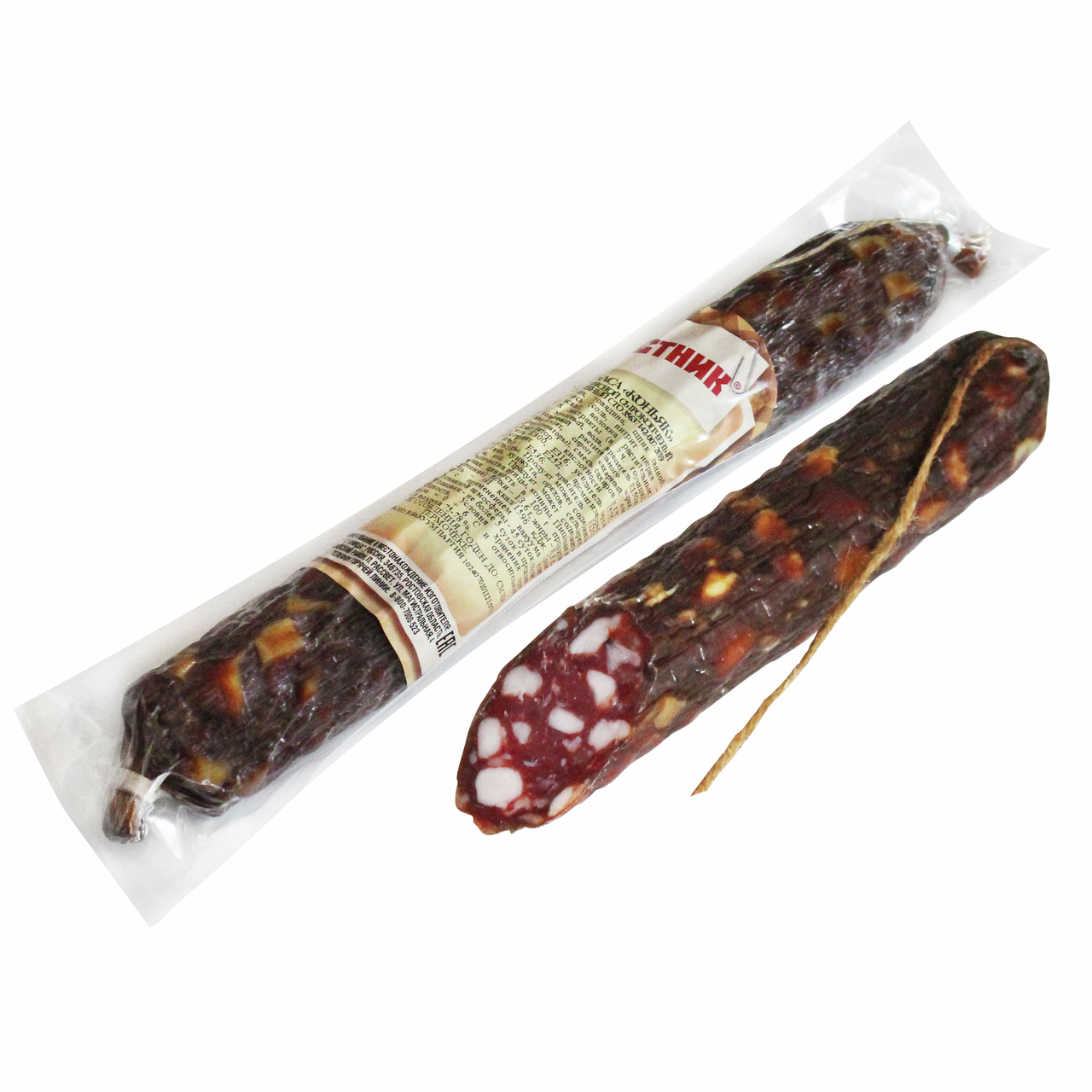 Колбаса сырокопченая Коньяк изготовлена из свинины и говядины с крупными кусочками шпика для сочности. Добавление коньячного бальзама в составе продукта позволяет раскрыть особый праздничный вкус. Безусловно станет оригинальным предложением к праздничному столу.