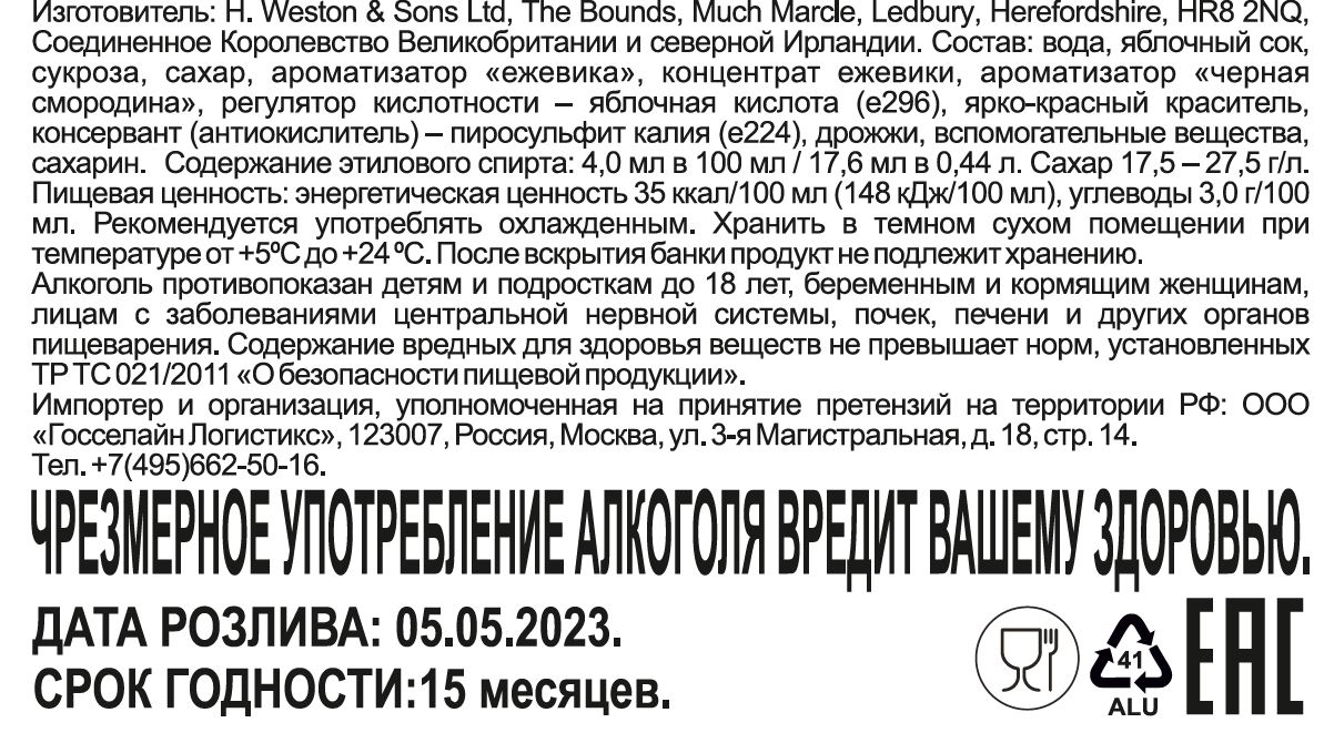 Это английский фруктовый сидр, который производится компанией Westons Cider в графстве Herefordshire. Он изготавливается из смеси сортов яблок, а также добавляются темные ягоды, такие как ежевика, смородина и черная смородина, для придания напитку насыщенного ягодного вкуса и аромата. Он идеально подходит для употребления в качестве аперитива или в сочетании с блюдами из свинины или птицы.
