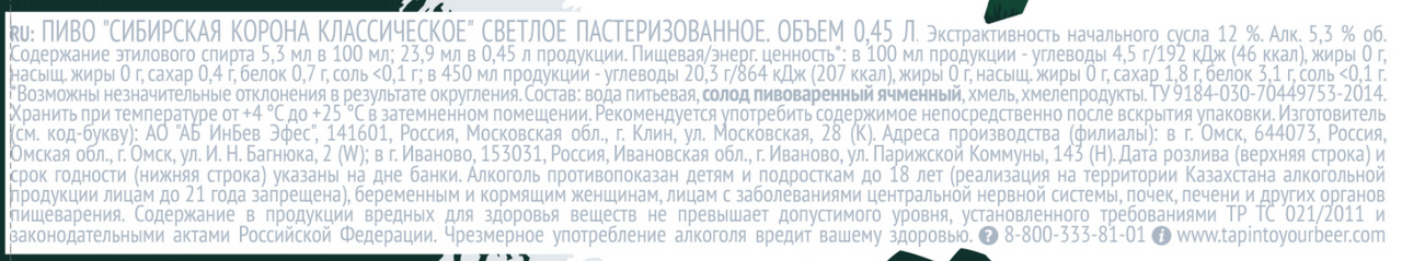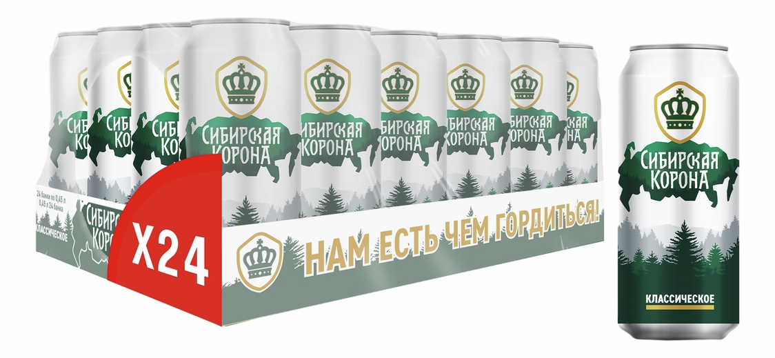 Пиво Сибирская Корона Классическое, 0.45л x 6шт - светлый лагер, присутствующий на рынке с 1996 года. Он характеризуется великолепной плотной пенной шапкой, богатым вкусом и освежающе-хмелевым ароматическим букетом. В его состав входят исключительно традиционные ингредиенты: ячменный солод, чистая вода и хмель. Пиво "Сибирская корона" Классическое универсально комбинируется с большинством традиционных закусок и блюд.