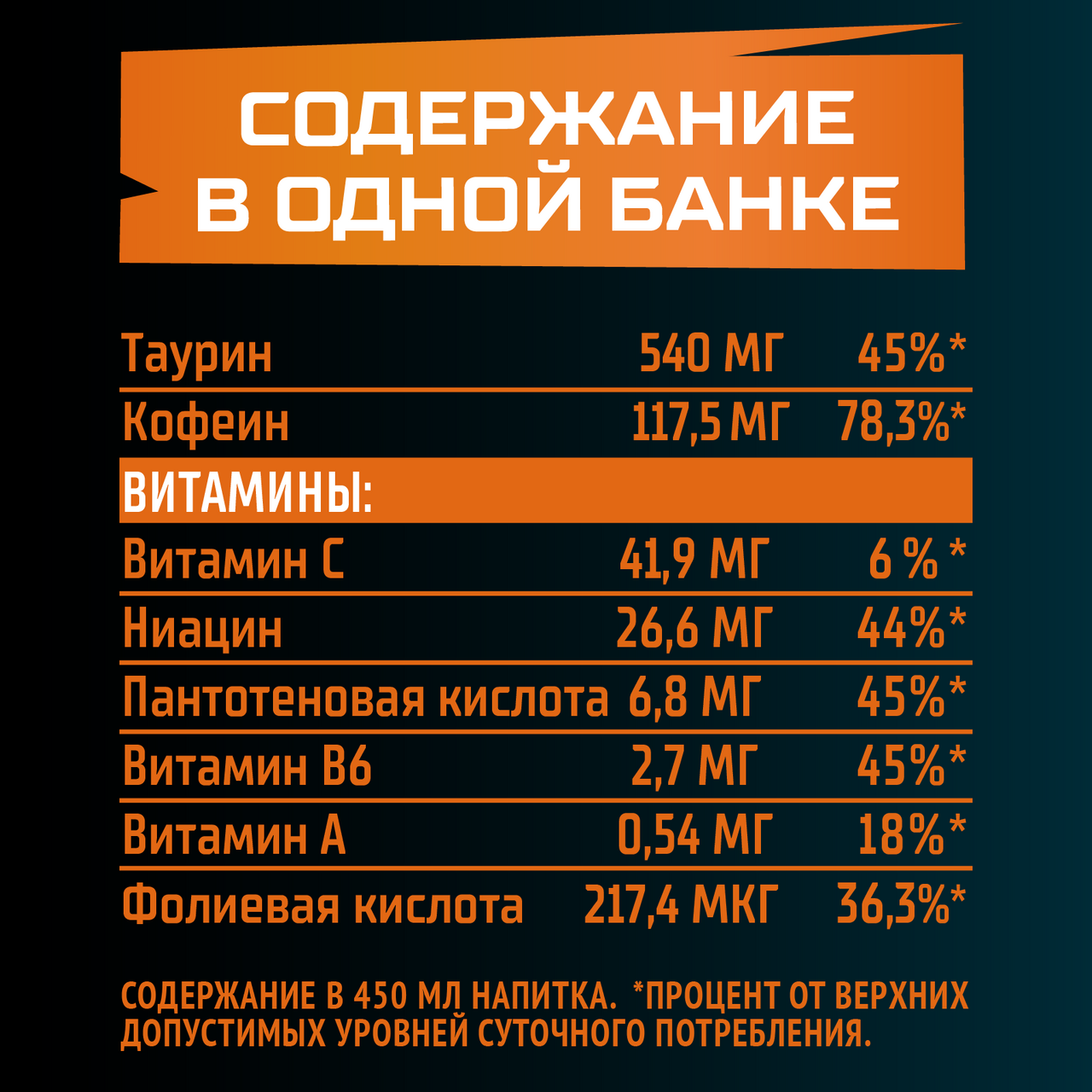 Вода питьевая очищенная, сахар, вкусо-ароматическая основа Апельсиновый ритм (таурин, ароматизатор, витамин C, кофеин, ниацин, пантотеновая кислота, бета-каротин, витамин B6, фолиевая кислота), регулятор кислотности кислота лимонная, антиокислитель кислота аскорбиновая, сок концентрированный апельсиновый, консерванты: сорбат калия и бензоат натрия.
