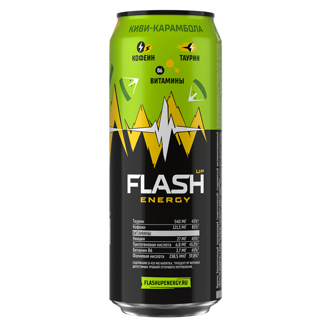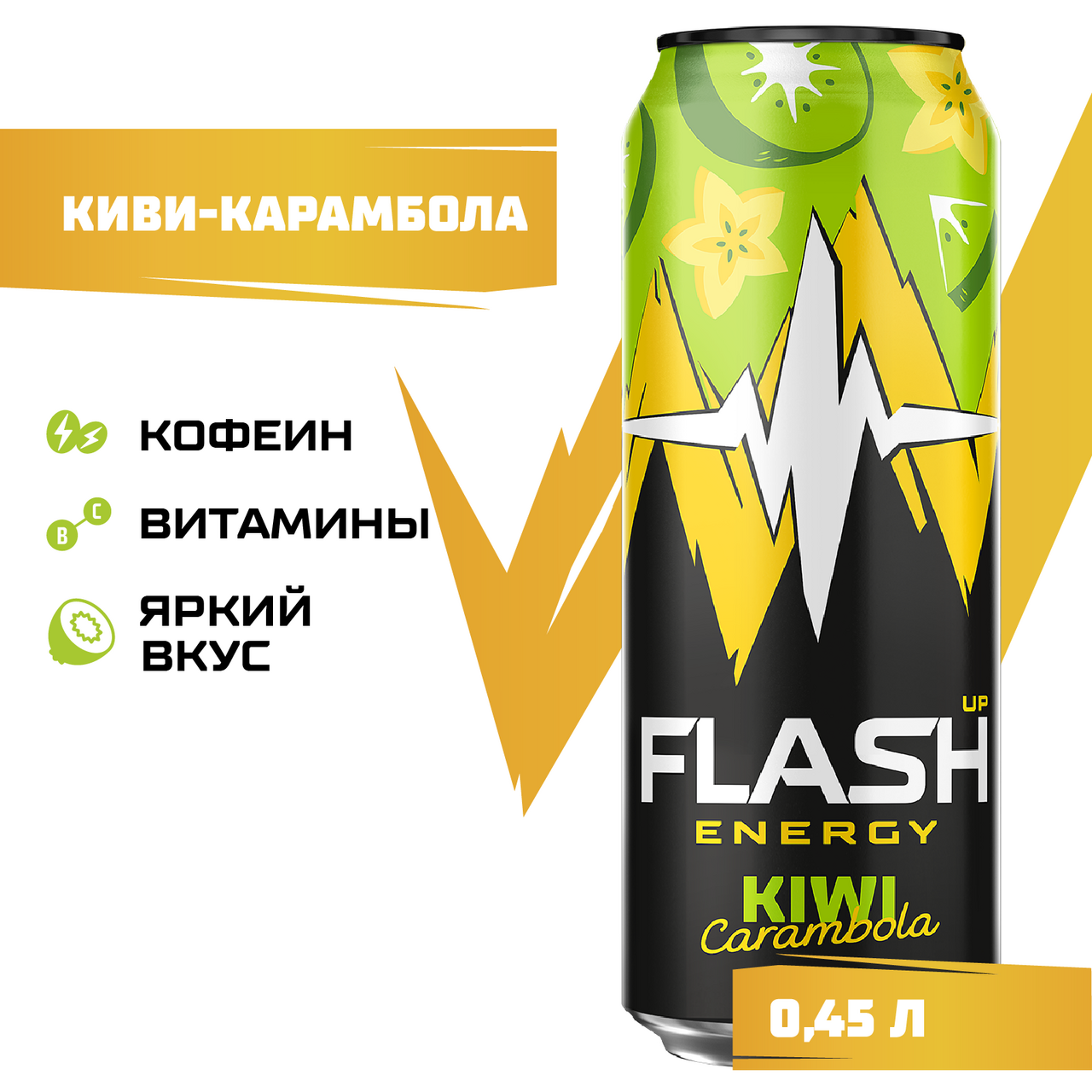 Flash Up Energy Kiwi-Carambola — безалкогольный энергетический напиток с уникальным миксом тропических фруктов — сочным киви и экзотической карамболой. Содержит кофеин, таурин и комплекс витаминов. Flash Up Energy — это энергетик для современных и активных людей, которым нужна дополнительная энергия и силы для прогресса каждый день. Он поможет вам взбодриться в течение напряженного дня и получить заряд энергии, необходимый как для работы, так и для развлечений.