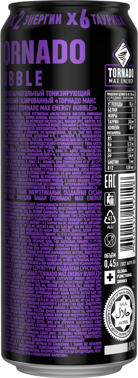Напиток энергетический Tornado Max Energy Bubble, 450мл