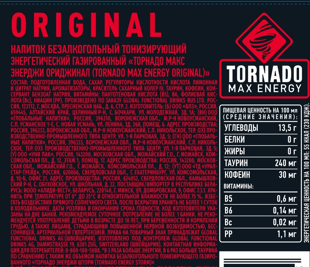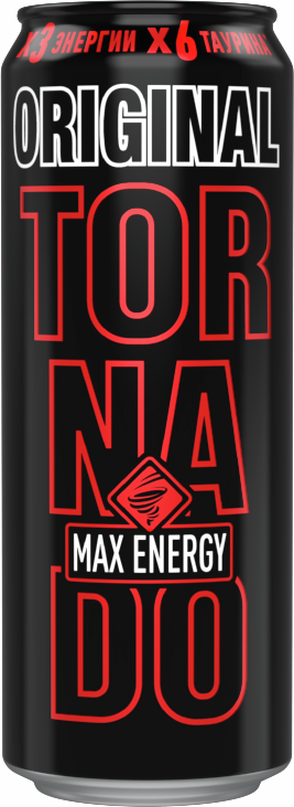 Напиток энергетический Tornado Max Energy Original, 450мл x 12 шт - заряд энергии в классическом исполнении. Повышает скорость реакции и помогает сконцентрироваться. Содержит ингредиенты высокого качества: кофеин, таурин, витамины B, сахар. Рекомендуется пить охлажденным.