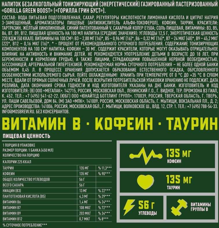 Освежающий и насыщенный фантазийный вкус, сочетающий в себе зеленые фрукты. идеальное решение для тех, кто ценит свою энергию и активный образ жизни. Каждая упаковка содержит 12 жестяных банок по 0.45 литра, что обеспечивает длительный заряд бодрости и силы. Специально разработанный состав без ГМО и обогащенный витаминами поможет вам быть всегда на пике своих возможностей. Энергетик Gorilla Green Boost изготовлен в России с соблюдением всех стандартов качества. Вкусовая композиция зеленых фруктов придаст напитку освежающий оттенок, а основа из яблока и фейхоа придаст ему неповторимый аромат.